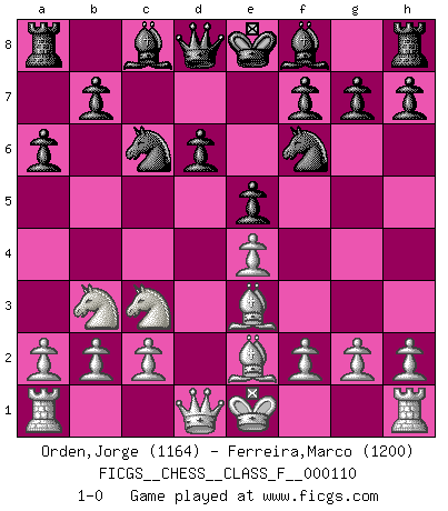 Last move : 1-0 2012 June 9 15:49:29 [Event "FICGS__CHESS__CLASS_F__000110"] [Site "FICGS"] [Date "2012.04.25"] [Round "1"] [White "Orden,Jorge"] [Black "Ferreira,Marco"] [Result "1-0"] [WhiteElo "1164"] [BlackElo "1200"] 1.e4 c5 2.Nf3 d6 3.d4 cxd4 4.Nxd4 Nf6 5.Nc3 a6 6.Be2 e5 7.Nb3 Nc6 8.Be3 1-0 This chess game has been lost on time (started : 2012.04.25 15:2:58) Sicilian : Najdorf, Opovcensky variation Player White won this chess game. Follow this game move after move (download)If Chess is a science, it's a most inexact one. If Chess is an art, it is too exacting to be seen as one. If Chess is a sport, it's too esoteric. If Chess is a game, it's too demanding to be just a game. If Chess is a mistress, she's a demanding one. If Chess is a passion, it's a rewarding one. If Chess is life, it's a sad one. (Unknown) Man wirke der falschen Auffassung entgegen, als ob jeder Zug Unmittelbares zu leisten habe; auch Werte- und Ruhezüge haben ihre Existenzberechtigung. (Aaron Nimzowitsch) La vida es como un juego de Ajedrez, cambiando con cada movimiento. (Proverbio Chino) Roi des jeux et jeu des rois, les échecs portent en eux un sentiment d'infini. Ils donnent à celui qui s'est efforcé d'en approfondir les arcanes l'impression de n'être pas à la mesure de l'homme; en fait, ils constituent un résumé de l'univers, un microcosme, et figurent cette grande échelle qui, dans les plans de la lumière descend jusqu'à la matière, qui des abîmes insondables remonte jusqu'en l'infini de Dieu. (Pyrame) It's not a bug - it's an undocumented feature. (Anonymous)