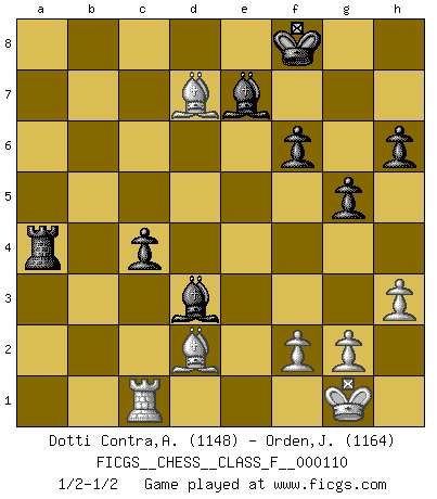 Last move : 1/2-1/2 2012 June 8 0:21:46 [Event "FICGS__CHESS__CLASS_F__000110"] [Site "FICGS"] [Date "2012.04.25"] [Round "1"] [White "Dotti Contra,Alessandro"] [Black "Orden,Jorge"] [Result "1/2-1/2"] [WhiteElo "1148"] [BlackElo "1164"] 1.e4 c5 2.Nf3 d6 3.Bc4 Nf6 4.Nc3 e6 5.d4 cxd4 6.Nxd4 a6 7.O-O Be7 8.Re1 O-O 9.Bg5 h6 10.Bh4 Nc6 11.e5 dxe5 12.Nxc6 bxc6 13.Qxd8 Rxd8 14.h3 g5 15.Bg3 Nd5 16.Bxe5 f6 17.Bg3 Nxc3 18.bxc3 Kf7 19.Rab1 a5 20.a4 Ba6 21.Bxe6+ Kf8 22.Bc7 Rd2 23.Rb2 Bd3 24.Rb8+ Rxb8 25.Bxb8 Rxc2 26.Bc7 Rxc3 27.Bxa5 Ra3 28.Rc1 Rxa4 29.Bd2 c5 30.Bd7 c4 1/2-1/2 Sicilian Kingside Castling by player White (move 7) Kingside Castling by player Black (move 8) This chess game ended in a draw. Follow this game move after move (download)Best by test: 1. e4 (Bobby Fischer) Fischer machte Schach einfach zu einer aufregenden Sache, wann immer er sich ans Brett setzte. (Raymond Keene) El Ajedrez por encima de todo... ¡es una pelea!. (Emanuel Lasker) RxDa4 pat (...) In theory there is no difference between theory and practice. In practice there is. (Yogi Berra)