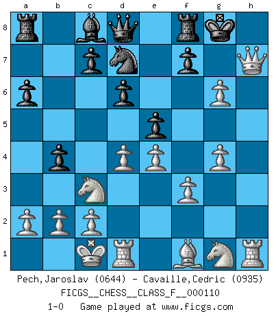 Last move : 1-0 2012 August 27 21:8:9 [Event "FICGS__CHESS__CLASS_F__000110"] [Site "FICGS"] [Date "2012.04.25"] [Round "1"] [White "Pech,Jaroslav"] [Black "Cavaille,Cedric"] [Result "1-0"] [WhiteElo "0644"] [BlackElo "0935"] 1.d4 g6 2.e4 d6 3.Nc3 Bg7 4.Be3 Nf6 5.Qd2 O-O 6.f3 Nbd7 7.O-O-O a6 8.g4 b5 9.h4 h6 10.Bxh6 Bxh6 11.Qxh6 b4 12.h5 Nh7 13.hxg6 e5 14.Qxh7+ 1-0 Modern defense Kingside Castling by player Black (move 5) Queenside Castling by player White (move 7) Player White won this chess game. Follow this game move after move (download)Any material change in a position must come about by mate, a capture, or a Pawn promotion. (Purdy) Bobby Fischer ist kein Vorbild für die heutige Jugend. (Viktor Kortschnoi) Una partida de Ajedrez se divide en 3 etapas: la primera cuando piensas que tienes la ventaja, la segunda cuando crees que tienes la ventaja y la tercera... ¡cuando te das cuenta que vas a perder!. (Savielly Tartakower) Dans le domaine de la peinture, de la gravure et de la sculpture, dès la première décennie de notre siècle, les artistes abandonnent la représentation de la partie d'échecs pour se concentrer sur les pièces, sur les échiquiers et sur toutes les variations auxquelles les unes et les autres peuvent donner lieu. On passe en quelque sorte d'un thème social à un thème musical (au sens de la musica médiévale, c'est-à-dire d'une notion qui inclue le rythme, l'harmonie, la construction et la déconstruction, etc.). Graphiquement et picturalement, l'échiquier apparaît comme une structure ouverte, dynamique, d'une richesse infinie, autorisant toutes les combinatoires et débouchant sur des mouvements et des rythmes de nature exponentielle. (Michel Pastoureau) Quotation,n.: The act of repeating erroneously the words of another. The words erroneously repeated. (Ambrose Bierce, The Devil's Dictionary)