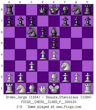 Last move : 1-0 2012 June 9 15:49:29 [Event "FICGS__CHESS__CLASS_F__000110"] [Site "FICGS"] [Date "2012.04.25"] [Round "1"] [White "Orden,Jorge"] [Black "Dsouza,Stanislaus"] [Result "1-0"] [WhiteElo "1164"] [BlackElo "1184"] 1.e4 e5 2.Nf3 d6 3.c3 Be6 4.Be2 Nc6 5.d4 1-0 This chess game has been lost on time (started : 2012.04.25 15:2:58) Philidor's defense Player White won this chess game. Follow this game move after move (download)First-class players lose to second-class players because second-class players sometimes play a first-class game. (Siegbert Tarrasch) Die Fehler sind da, Sie warten nur darauf gemacht zu werden. (Savielly Grigorievitsch Tartakower) En el Ajedrez, cuando menos, el valiente hereda la tierra. (Edmar Mednis) Soyez une menace à chaque fois que vous vous asseyez pour jouer. (Ken Smith) Life is verb, not a noun. (Charlotte Perkins Gilman)