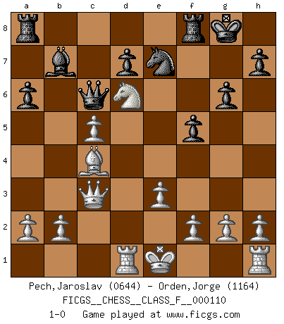 Last move : 1-0 2012 October 5 17:26:7 [Event "FICGS__CHESS__CLASS_F__000110"] [Site "FICGS"] [Date "2012.04.25"] [Round "1"] [White "Pech,Jaroslav"] [Black "Orden,Jorge"] [Result "1-0"] [WhiteElo "0644"] [BlackElo "1164"] 1.c4 c5 2.Nc3 Nc6 3.Nf3 g6 4.e3 Bg7 5.d4 e6 6.dxc5 Nge7 7.Bd2 a6 8.Qc2 Nb4 9.Qb3 Nbc6 10.Ne4 O-O 11.Rd1 Qc7 12.Bc3 f5 13.Bxg7 Kxg7 14.Qc3+ e5 15.Nd6 b6 16.Nxe5 Kg8 17.cxb6 Qxb6 18.Nxc6 Qxc6 19.c5 Bb7 20.Bc4+ 1-0 English : Symmetrical variation Kingside Castling by player Black (move 10) Player White won this chess game. Follow this game move after move (download)In Chess, as it is played by masters, chance is practically eliminated. (Emanuel Lasker) Aljechin war kein Nazi. Er war ein Opportunist. Ein schrecklicher Mann. Er liebte Geld über alles und würde für Geld ein Jude, ein Katolik oder ein Protestant werden. (Miguel Najdorf) Cada Peón es potencialmente una Reina. (James Mason) Comme les marins qui ont mille raisons différentes d'aller en mer, les joueurs d'échecs en ont tout autant avant de s'installer devant une table et jouer... (Vincent Bertignac, philosophe) Difficult things take a long time, impossible things a little longer. (Author unknown)