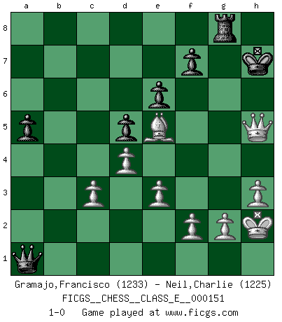 Last move : 1-0 2012 July 29 1:32:18 [Event "FICGS__CHESS__CLASS_E__000151"] [Site "FICGS"] [Date "2012.04.26"] [Round "1"] [White "Gramajo,Francisco"] [Black "Neil,Charlie"] [Result "1-0"] [WhiteElo "1233"] [BlackElo "1225"] 1.Nf3 d5 2.d4 Nf6 3.Bg5 e6 4.h3 Nbd7 5.e3 c6 6.Bf4 Qa5+ 7.c3 Be7 8.Be2 Nf8 9.Ne5 N8d7 10.O-O b5 11.Nxc6 Qb6 12.Nxe7 Kxe7 13.a4 Re8 14.Na3 bxa4 15.Nb5 Kf8 16.Nc7 Ba6 17.Nxa8 Rxa8 18.Bxa6 Qxa6 19.Rxa4 Qb5 20.Rb4 Qa6 21.Qa4 Qd3 22.Bd6+ Kg8 23.Qc6 Re8 24.Rb7 a5 25.Rxd7 Nxd7 26.Qxd7 Ra8 27.Ra1 g5 28.Qe7 h6 29.Qf6 Qc2 30.Qxh6 Qxb2 31.Qxg5+ Kh7 32.Be5 Qxa1+ 33.Kh2 Rg8 34.Qh5+ 1-0 Reti Opening Kingside Castling by player White (move 10) Player White won this chess game. Follow this game move after move (download)A passed Pawn increases in strength as the number of pieces on the board diminishes. (Capablanca) Ich habe Kasparov in Rente geschickt. (Veselin Topalov) El Jaque al descubierto es el bombardero del tablero. (Reuben Fine) Aidez vos pièces, elles vous aideront. (Paul Morphy) I've never seen so many men wasted so badly. (Blondie in The Good, The Bad and The Ugly)