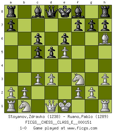 Last move : 1-0 2012 June 9 3:49:27 [Event "FICGS__CHESS__CLASS_E__000151"] [Site "FICGS"] [Date "2012.04.26"] [Round "1"] [White "Stoyanov,Zdravko"] [Black "Ruano,Pablo"] [Result "1-0"] [WhiteElo "1238"] [BlackElo "1289"] 1.e4 c5 2.Nf3 e6 3.c3 Nc6 4.Bb5 Nf6 5.Bxc6 bxc6 6.d3 d5 7.e5 Ng4 8.h3 Nh6 9.Bxh6 1-0 This chess game has been lost on time (started : 2012.04.26 16:2:39) Sicilian defense Player White won this chess game. Follow this game move after move (download)Chess is a forcing house where the fruits of character can ripen more fully than in life. (Edward Morgan Foster) Deine Wertungszahl - vorausgesetzt einige Jahre schachliche Anstrengung - entspricht etwa dem zehnfachen Deines IQ plus 1000. (Jonathan Levitt) La enorme capacidad mental, en la que sin ella no puede un jugador de Ajedrez existir, es demasiado requerida por el Ajedrez al grado de que nunca podrá liberar su mente de este juego. (Albert Einstein) Il n'y a pas de prix trop élevé au scalp de l'ennemi. (Koblentz) To send light into the darkness of men's hearts - such is the duty of the artist. (Schumann)