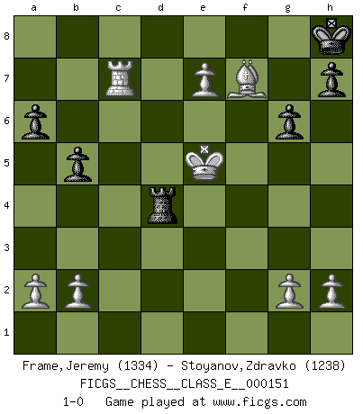 Last move : 1-0 2012 May 1 21:13:51 [Event "FICGS__CHESS__CLASS_E__000151"] [Site "FICGS"] [Date "2012.04.26"] [Round "1"] [White "Frame,Jeremy"] [Black "Stoyanov,Zdravko"] [Result "1-0"] [WhiteElo "1334"] [BlackElo "1238"] 1.e4 c5 2.Nf3 a6 3.c3 Nc6 4.d4 cxd4 5.cxd4 e6 6.Nc3 Bb4 7.Bd2 Nxd4 8.Nxd4 Qb6 9.Nf3 Bc5 10.Be3 Bxe3 11.fxe3 Qxe3+ 12.Be2 Nf6 13.Qd3 Ng4 14.Qxe3 Nxe3 15.Kf2 Ng4+ 16.Kg3 Nf6 17.e5 Nd5 18.Nxd5 exd5 19.Rac1 O-O 20.Rhd1 b5 21.Rxd5 Bb7 22.Rxd7 Bxf3 23.Bxf3 Rad8 24.R1c7 Rde8 25.Bd5 Rd8 26.Rxf7 Rxf7 27.Bxf7+ Kh8 28.e6 g6 29.e7 Rd3+ 30.Kf4 Rd4+ 31.Ke5 1-0 Sicilian : O'Kelly variation Kingside Castling by player Black (move 19) Player White won this chess game. Follow this game move after move (download)Life is a kind of Chess, with struggle, competition, good and ill events. (Benjamin Franklin) Woher wissen wir, daß der Neanderthaler Blindschach gespielt hat? -- Bei Ausgrabungen wurden keine Schachbretter und Figuren gefunden. (Anonymous) Aquellos que dicen entender al Ajedrez, no entienden nada. (Robert Hubner) Ce qui caractérise les parties de combat, c'est que si le défenseur a constamment de difficiles problèmes à résoudre, l'attaquant doit chercher sans relâche de nouvelles possibilités d'attaque. (Koblentz) Gambling : The sure way of getting nothing from something. (Wilson Mizner)