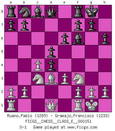 Last move : 0-1 2012 June 9 15:49:29 [Event "FICGS__CHESS__CLASS_E__000151"] [Site "FICGS"] [Date "2012.04.26"] [Round "1"] [White "Ruano,Pablo"] [Black "Gramajo,Francisco"] [Result "0-1"] [WhiteElo "1289"] [BlackElo "1233"] 1.d4 Nf6 2.c4 e6 3.Nc3 d5 4.Bg5 Be7 5.e3 h6 6.Bxf6 Bxf6 7.Nf3 O-O 8.Bd3 c5 9.O-O cxd4 0-1 This chess game has been lost on time (started : 2012.04.26 16:2:39) Queen's pawn game Kingside Castling by player Black (move 7) Kingside Castling by player White (move 9) Player Black won this chess game. Follow this game move after move (download)Becoming successful at Chess allows you to discover your own personality. That's what I want for the kids I teach. (Saudin Robovic) Intelligenz läßt sich nicht am Weg, sondern nur am Ergebnis feststellen. (Garry Kasparov) No nos podemos resistir a la fascinación de un sacrificio ya que la pasión por los sacrificios es parte de la naturaleza de un jugador de Ajedrez. (Rudolf Spielman) Même si l'adversaire joue le coup analysé précédemment, recommencez l'analyse en voyant la nouvelle position. Première règle de Blumenfeld The beginning is the most important part of the work. (Plato)