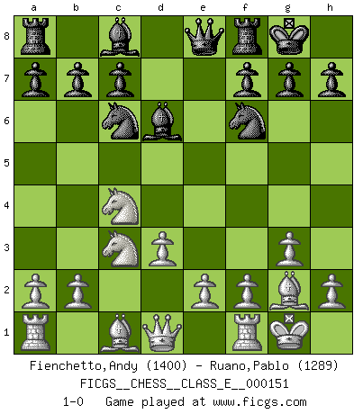 Last move : 1-0 2012 June 9 3:49:27 [Event "FICGS__CHESS__CLASS_E__000151"] [Site "FICGS"] [Date "2012.04.26"] [Round "1"] [White "Fienchetto,Andy"] [Black "Ruano,Pablo"] [Result "1-0"] [WhiteElo "1400"] [BlackElo "1289"] 1.c4 Nf6 2.g3 d5 3.cxd5 Qxd5 4.Nf3 Qc6 5.Bg2 e5 6.d3 Bd6 7.O-O O-O 8.Nxe5 Qe8 9.Nc4 Nc6 10.Nc3 1-0 This chess game has been lost on time (started : 2012.04.26 16:2:39) English, 1...Nf6 (Anglo-Indian defense) Kingside Castling by player White (move 7) Kingside Castling by player Black (move 7) Player White won this chess game. Follow this game move after move (download)The sign of a great Master is his ability to win a won game quickly and painlessly. (Irving Chernev) Wie ich sie so einen nach dem anderen nieder mähte wurde meine Überlegenheit offensichtlich. (José Raúl Capablanca) El Ajedrez es una hermosa aventura. (Bent Larsen) Je crois qu'il existe des manières très spécifiques de jouer efficacement contre une machine. Evidemment, nous n'avons aucune chance en technique pure, parce que l'ordinateur calcule de manière parfaite. Mais lorsque nous faisons appel à notre cerveau, en utilisant l'intuition et la compréhension, alors nous restons beaucoup plus forts. (Anatoli Karpov) To steal ideas from one person is plagiarism. To steal from many is research. (Unknown)