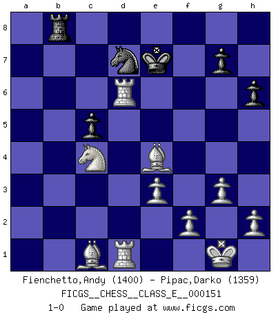 Last move : 1-0 2012 May 15 22:31:27 [Event "FICGS__CHESS__CLASS_E__000151"] [Site "FICGS"] [Date "2012.04.26"] [Round "1"] [White "Fienchetto,Andy"] [Black "Pipac,Darko"] [Result "1-0"] [WhiteElo "1400"] [BlackElo "1359"] 1.c4 c5 2.g3 Nc6 3.Bg2 Nf6 4.Nf3 e5 5.d3 d6 6.Nc3 h6 7.a3 a6 8.O-O Bg4 9.Rb1 Rb8 10.b4 b5 11.Nd2 Bd7 12.bxc5 dxc5 13.cxb5 axb5 14.Nxb5 Nd4 15.a4 Bxb5 16.axb5 Qa5 17.Nc4 Qc7 18.e3 Nxb5 19.Qa4 Qa7 20.Qxa7 Nxa7 21.Rxb8+ Ke7 22.Rb7+ Nd7 23.Rxa7 Ke6 24.Bh3+ f5 25.Ra6+ Kd5 26.Bg2+ e4 27.Nd2 Bd6 28.dxe4+ fxe4 29.Bxe4+ Ke6 30.Nc4 Rb8 31.Rxd6+ Ke7 32.Rfd1 1-0 English : Symmetrical variation Kingside Castling by player White (move 8) Player White won this chess game. Follow this game move after move (download)White lost because he failed to remember the right continuation and had to think up the moves himself. (Siegbert Tarrasch) Wenn du nicht weißt was du tun sollst, warte bis dein Gegner eine Idee hat. Sie wird sicher schlecht sein. (Siegbert Tarrasch) No hay precio que no valga la pena por la cabellera del Rey enemigo. (Koblentz) Les échecs sont un jeu terrible. Si vous n'avez pas le centre, votre adversaire a une position plus libre. Par contre, si vous avez le centre, alors vous avez vraiment quelque chose pour laquelle vous inquiéter ! (Siegbert Tarrasch) He who fights with monsters should be careful lest he thereby become a monster. (Friedrich Nietzsche, Beyond Good and Evil)