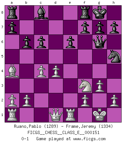 Last move : 0-1 2012 September 28 17:53:18 [Event "FICGS__CHESS__CLASS_E__000151"] [Site "FICGS"] [Date "2012.04.26"] [Round "1"] [White "Ruano,Pablo"] [Black "Frame,Jeremy"] [Result "0-1"] [WhiteElo "1289"] [BlackElo "1334"] 1.d4 d5 2.Nc3 c6 3.e4 dxe4 4.Nxe4 e6 5.Bg5 Be7 6.Nf3 Nf6 7.Nxf6+ Bxf6 8.Bxf6 Qxf6 9.Bc4 O-O 10.O-O Nd7 11.Re1 Nb6 12.Bd3 Nd5 13.c4 Nf4 14.Bc2 b6 15.Ba4 Qg6 16.g3 Nh5 0-1 This chess game has been lost on time (started : 2012.04.26 16:2:39) Queen's pawn : Chigorin variation Kingside Castling by player Black (move 9) Kingside Castling by player White (move 10) Player Black won this chess game. Follow this game move after move (download)All that matters on the Chessboard is good moves. (Bobby Fischer) Schach ist das schnellste Spiel der Welt, weil man in jeder Sekunde Tausende von Gedanken ordnen muß. (Albert Einstein) Un jugador que trata de regresar una movida en el Ajedrez es un futuro carterista. (Richard Fenton) Horreur, mais aussi harmonie suprême : qu'y avait-il en effet au monde en dehors des échecs ? Le brouillard, l'inconnu, le non-être... (Vladimir Nabokov) There's no money in correspondence chess. (John Knudsen)