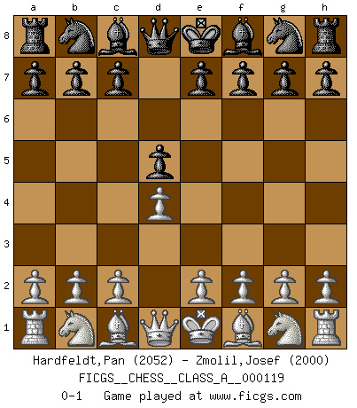Last move : 0-1 2012 June 11 4:0:10 [Event "FICGS__CHESS__CLASS_A__000119"] [Site "FICGS"] [Date "2012.04.28"] [Round "1"] [White "Hardfeldt,Pan"] [Black "Zmolil,Josef"] [Result "0-1"] [WhiteElo "2052"] [BlackElo "2000"] 1.d4 d5 0-1 This chess game has been lost on time (started : 2012.04.28 20:55:24) Queen's pawn game Player Black won this chess game. Follow this game move after move (download)Fischer prefers to enter Chess history alone. (Miguel Najdorf) Am wohlsten fühle ich mich, wenn ich sehe, wie sich mein Gegner im Todeskampf windet. (Robert James Fischer) Personalmente, yo prefiero mirar hacia el futuro en donde un programa de computadora gane el título mundial de Ajedrez. La humanidad necesita una lección de humildad. (Richard Dawkings) Une platitude souvent récitée à propos des Echecs est qu'une des choses les plus difficiles à réaliser est de gagner une position gagnante. Cela ne manque pas de sens mais, pour ma part, j'ai toujours trouvé plus difficile de gagner une position perdante. (Tim Krabbe) Is not life a hundred times too short to bore ourselves ? (Friedrich Nietzsche)