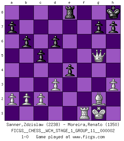 Last move : 1-0 2007 March 15 2:25:35 [Event "FICGS__CHESS__WCH_STAGE_1_GROUP_11__000002"] [Site "FICGS"] [Date "2007.01.16"] [Round "1"] [White "Sanner,Zdzislaw"] [Black "Moreira,Renato"] [Result "1-0"] [WhiteElo "2238"] [BlackElo "1350"] 1.e4 c5 2.Nf3 Nc6 3.d3 d6 4.g3 Bg4 5.Bg2 e6 6.O-O Be7 7.Be3 Nf6 8.Nbd2 O-O 9.h3 Bh5 10.g4 Bg6 11.Nh4 Nxg4 12.Nxg6 Nxe3 13.Nxe7+ Qxe7 14.fxe3 Qg5 15.Qe2 Ne5 16.Nf3 Nxf3+ 17.Rxf3 f5 18.exf5 Rxf5 19.Rxf5 exf5 20.Qf3 Re8 21.Rf1 b6 22.Qd5+ Kh8 23.e4 fxe4 24.Qxg5 1-0 Sicilian defense Kingside Castling by player White (move 6) Kingside Castling by player Black (move 8) Player White won this chess game. Follow this game move after move (download)When the Chess game is over, the Pawn and the King go back to the same box. (Irish saying) Je mehr wir mit Computern analysieren, desto mehr glauben wir an Verteidigung. (Vladimir Kramnik) El muchacho (en ese entonces un niño de 12 años llamado Anatoly Karpov) no tiene ni idea de lo que es el Ajedrez y no hay futuro en absoluto para el en esta profesión. (Mikhail Botvinnik) Les Echecs mettent en conflit, non pas deux intelligences, mais deux volontés. (Lasker) The existence of forgetting has never been proved: We only know that some things don't come to mind when we want them. (Friedrich Nietzsche)