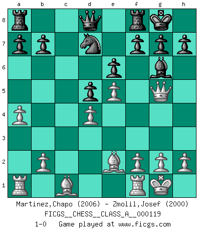 Last move : 1-0 2012 November 13 20:24:11 [Event "FICGS__CHESS__CLASS_A__000119"] [Site "FICGS"] [Date "2012.04.28"] [Round "1"] [White "Martinez,Chapo"] [Black "Zmolil,Josef"] [Result "1-0"] [WhiteElo "2006"] [BlackElo "2000"] 1.d4 d5 2.c4 c6 3.Nc3 Nf6 4.Nf3 dxc4 5.a4 Bf5 6.e3 e6 7.Bxc4 Bb4 8.O-O O-O 9.Qe2 Nbd7 10.e4 Bg6 11.Bd3 Bh5 12.e5 Nd5 13.Nxd5 cxd5 14.Qe3 Be7 15.Ng5 Bxg5 16.Qxg5 Bg6 17.Be2 1-0 This chess game has been lost on time (started : 2012.04.28 20:55:24) QGD Slav defense Kingside Castling by player White (move 8) Kingside Castling by player Black (move 8) Player White won this chess game. Follow this game move after move (download)You may learn much more from a game you lose than from a game you win. You will have to lose hundreds of games before becoming a good player. (Jose Raul Capablanca) Mit Schach schule ich mein Gefühl für Geometrie, was für Tennis und Schach gleichermaßen wichtig ist. (Boris Becker) Vive, pierde y aprende al observar a tu oponente como ganar. (Amber Steenbock) Les Cavaliers se révèlent fort utiles dans les positions fermées. D'habitude, les Fous sont un peu plus forts que les Cavaliers dans les positions ouvertes. Qu'on le veuille ou non, il restera toujours des exceptions ! Are you threatening me, Master Jedi ? (Chancellor Palpatine in Star Wars ep.3)