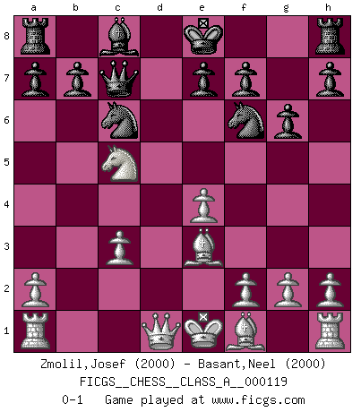Last move : 0-1 2012 November 27 15:47:26 [Event "FICGS__CHESS__CLASS_A__000119"] [Site "FICGS"] [Date "2012.04.28"] [Round "1"] [White "Zmolil,Josef"] [Black "Basant,Neel"] [Result "0-1"] [WhiteElo "2000"] [BlackElo "2000"] 1.e4 c5 2.Nf3 Nc6 3.d4 cxd4 4.Nxd4 g6 5.c4 d6 6.Nc3 Bg7 7.Be3 Qb6 8.Nb3 Bxc3+ 9.bxc3 Qc7 10.c5 dxc5 11.Nxc5 Nf6 0-1 This chess game has been lost on time (started : 2012.04.28 20:55:24) Sicilian : Accelerated Fianchetto, Maroczy bind Player Black won this chess game. Follow this game move after move (download)Winning isn't everything... but losing is nothing. (Mednis) Besser ein falscher Plan, logisch durchgeführt, als gar kein Plan. (Viktor Kortschnoi) La belleza de un movimiento no se refleja solo en su apariencia, sino en el pensamiento detrás de él. (Siegbert Tarrasch) Je ne crois pas en la psychologie, je crois aux bons coups. (Robert Fischer) Locking firmely the window serves nothing, only small thiefs pass through there, the big thiefs enter through the front door. (Luc-Olivier Leclerc)