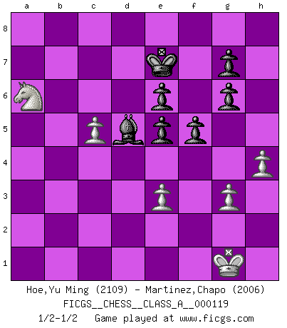 Last move : 1/2-1/2 2012 December 15 4:20:31 [Event "FICGS__CHESS__CLASS_A__000119"] [Site "FICGS"] [Date "2012.04.28"] [Round "1"] [White "Hoe,Yu Ming"] [Black "Martinez,Chapo"] [Result "1/2-1/2"] [WhiteElo "2109"] [BlackElo "2006"] 1.e4 c5 2.Nf3 Nc6 3.Bb5 e6 4.O-O Nge7 5.d4 cxd4 6.Nxd4 Qb6 7.Nxc6 bxc6 8.Be2 Ng6 9.c4 Be7 10.Nc3 O-O 11.Rb1 a5 12.Be3 c5 13.a3 d6 14.b4 axb4 15.axb4 Qc7 16.e5 dxe5 17.bxc5 Rd8 18.Qb3 Bxc5 19.Bf3 Ra3 20.Nb5 Rxb3 21.Nxc7 Rxb1 22.Rxb1 Bxe3 23.fxe3 f5 24.Rb8 Kf7 25.Bh5 Ke7 26.Bxg6 hxg6 27.h4 Bd7 28.Rb4 Rc8 29.Na6 Bc6 30.c5 Be4 31.Rb6 Kf6 32.g3 Bd5 33.Rb8 Rxb8 34.Nxb8 Ke7 35.Na6 1/2-1/2 Sicilian : Nimzovich-Rossolimo attack (without ...d6) Kingside Castling by player White (move 4) Kingside Castling by player Black (move 10) This chess game ended in a draw. Follow this game move after move (download)A great player and a great example for many. His book My 60 Memorable Games had a big impact on me. It is a shame he didn't continue to enrich the world of chess with his unparalleled understanding after 1972. (Jan Timman, about Bobby Fischer's death) Als er Schachweltmeister wurde ließ er praktisch alle stärksten Sovietspieler für sich arbeiten. Wenn ein auch nur mittelmässiger Meister ein Spezialist für eine bestimmte Eröffnung war, wurde er von Karpov gerufen. Das wurde alles geheim gehalten. (Mikhail Moiseyevich Botvinik) Cuando tu casa esta en llamas, no puedes ser molestado por tus vecinos. O, como decinos en Ajedrez, si tu Rey esta bajo ataque, no te preocupa perder un Peón del lado de la Reina. (Gary Kasparov) La menace est plus forte que l'exécution. (Aaron Nimzovitch) Mandala - that's it! 16x16 squares as multiple of the four and the eight because of the Four Noble Truths and the Noble Eightfold Path. (Heinz-Georg Lehnhoff about Big Chess)