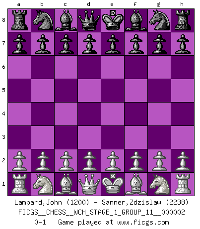 Last move : 0-1 2007 February 15 16:26:34 [Event "FICGS__CHESS__WCH_STAGE_1_GROUP_11__000002"] [Site "FICGS"] [Date "2007.01.16"] [Round "1"] [White "Lampard,John"] [Black "Sanner,Zdzislaw"] [Result "0-1"] [WhiteElo "1200"] [BlackElo "2238"] 0-1 This chess game has been lost on time (started : 2007.01.16 15:22:40) Player Black won this chess game. Follow this game move after move (download)The way he plays Chess demonstrates a man's whole nature. (Stanley Ellin) Schach ist eine Sache der genauen Beurteilung, wann man zuschlagen und wann man sich ducken muss. (Robert James Fischer) Ciertamente el estado mental actual de Bobby Fischer es una tragedia. Uno de los mas grandes jugadores de Ajedrez del mundo -el orgullo y pena del Ajedrez Americano. (Frank Brady) Même si vous avez un bon coup à faire, regardez toujours s'il n'y en a pas un qui lui soit préférable. (Pedro Damiano) If only people were all showed a certain minimum level of niceness; if only people didn't retract verbal draw offers (without draw box ticked) on ficgs; if only people didn't kill; if only people didn't run concentration / extermination camps, if only people didn't drop nuclear bombs on Hiroshima and Nagasaki, and so on - it would be a much more beautiful world. But sadly, things are not so... (Normajean Yates)