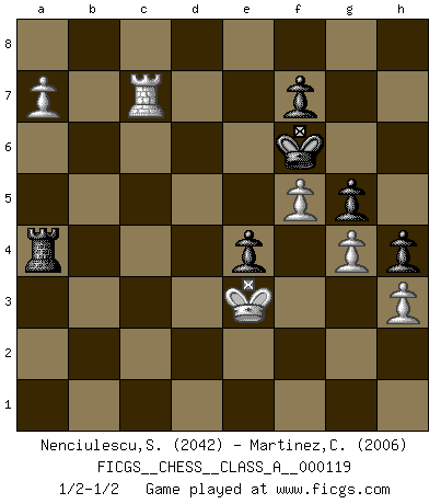Last move : 1/2-1/2 2012 October 8 14:56:48 [Event "FICGS__CHESS__CLASS_A__000119"] [Site "FICGS"] [Date "2012.04.28"] [Round "1"] [White "Nenciulescu,Silviu"] [Black "Martinez,Chapo"] [Result "1/2-1/2"] [WhiteElo "2042"] [BlackElo "2006"] 1.d4 d5 2.c4 c6 3.Nf3 Nf6 4.Nc3 e6 5.cxd5 exd5 6.Bg5 h6 7.Bh4 Bf5 8.Qb3 g5 9.Bg3 Qb6 10.e3 Qxb3 11.axb3 Nbd7 12.Be2 Bb4 13.O-O Nh5 14.Bc7 Ng7 15.h3 Ne6 16.Bh2 a5 17.Ne1 O-O 18.Bd3 Bh7 19.Bxh7+ Kxh7 20.Nd3 Be7 21.g4 h5 22.Ne2 Nf6 23.f3 h4 24.Kg2 Ra6 25.Ra4 Rfa8 26.Rfa1 Nd7 27.f4 Nb6 28.R4a2 Kg7 29.f5 Nf8 30.Nc5 Bxc5 31.dxc5 Nbd7 32.Bd6 Nf6 33.b4 Re8 34.Rxa5 Rxa5 35.bxa5 Ne4 36.Bxf8+ Rxf8 37.b4 Nd2 38.Nd4 Re8 39.Kf2 Nc4 40.b5 cxb5 41.Nxb5 Rc8 42.Nd6 Nxd6 43.cxd6 Rd8 44.Rb1 Rd7 45.Rb5 Rxd6 46.Rxb7 Rc6 47.Kf3 Rc3 48.Rd7 Rc5 49.a6 Ra5 50.a7 Ra2 51.Rb7 Kf6 52.e4 Ra3+ 53.Kf2 dxe4 54.Rd7 Kg7 55.Rc7 Ra4 56.Ke3 Kf6 1/2-1/2 QGD Slav : 4.Nc3 Kingside Castling by player White (move 13) Kingside Castling by player Black (move 17) This chess game ended in a draw. Follow this game move after move (download)Bobby Fischer's current state of mind is indeed a tragedy. One of the world's greatest Chess players - the pride and sorrow of American Chess. (Frank Brady) Ein unbeabsichtigtes Patt ist der Gipfel der Dummheit. (Anonymous) Durante una competencia de Ajedrez, un Maestro de Ajedrez deberá ser una combinación de presa de caza y un Monge. (Alexander Alekhine) Mon pion favori sur ma case favorite ! Bronstein en parlant d'un coup de pion en h5 quand il avait les Noirs. You can think I'm wrong, but that's no reason to quit thinking. (Gregory House, House M.D.)