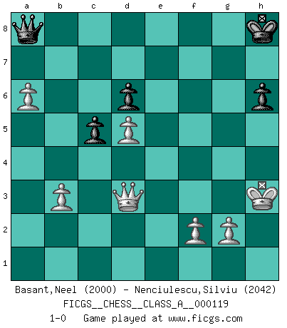 Last move : 1-0 2012 September 30 19:57:32 [Event "FICGS__CHESS__CLASS_A__000119"] [Site "FICGS"] [Date "2012.04.28"] [Round "1"] [White "Basant,Neel"] [Black "Nenciulescu,Silviu"] [Result "1-0"] [WhiteElo "2000"] [BlackElo "2042"] 1.Nf3 c5 2.c4 Nf6 3.Nc3 d6 4.e3 g6 5.Be2 Bg7 6.O-O O-O 7.d4 Bf5 8.h3 Na6 9.d5 Ne4 10.Nxe4 Bxe4 11.Ng5 Bf5 12.Re1 Rb8 13.e4 Bd7 14.Rb1 b5 15.Nf3 Nc7 16.b3 bxc4 17.Bxc4 Nb5 18.Qd3 Qa5 19.Bd2 Qb6 20.Rbc1 Na3 21.e5 Bf5 22.Qe2 Nxc4 23.Qxc4 Qb7 24.Bc3 f6 25.exd6 exd6 26.Qf4 Rbd8 27.Rcd1 a5 28.Nd2 Bc2 29.Rc1 Bd3 30.Qf3 Ba6 31.Bxa5 Rd7 32.Bc3 Qa8 33.Rcd1 f5 34.Bxg7 Kxg7 35.Qc3+ Kg8 36.a4 Qd8 37.Re6 Ra7 38.Nc4 Bxc4 39.Qxc4 Qb6 40.Rde1 Rb7 41.R1e3 f4 42.Rf3 Rbf7 43.Re4 g5 44.h4 gxh4 45.R3xf4 Rxf4 46.Rxf4 Qd8 47.Rxf8+ Kxf8 48.Qc3 Kg8 49.a5 Qa8 50.Qd2 h6 51.Kh2 h3 52.Kxh3 Kh7 53.Qd3+ Kh8 54.a6 1-0 Reti Opening Kingside Castling by player White (move 6) Kingside Castling by player Black (move 6) Player White won this chess game. Follow this game move after move (download)Chess is a part of culture and if a culture is declining then Chess too will decline. (Mikhail Botvinnik) Es gibt Leute, die glauben, alles wäre vernünftig, was man mit einem ernsthaften Gesicht tut. (Georg Christoph Lichtenberg) Ser exitoso en el Ajedrez te permite descubrir tu propia personalidad. Eso es lo que deseo para los niños de mi clase. (Saudin Robovic) Tous ces prétendus hommes politiques sont les pions, les Cavaliers, les Tours ou les Fous d'une partie d'échecs qui se jouera tant qu'un hasard ne renversera pas l'échiquier. (Honoré de Balzac) Any activity becomes creative when the doer cares about doing it right or doing it better. (John Updike)