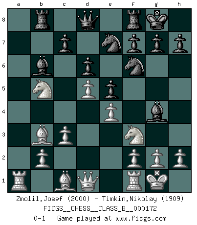 Last move : 0-1 2012 November 26 23:12:11 [Event "FICGS__CHESS__CLASS_B__000172"] [Site "FICGS"] [Date "2012.04.29"] [Round "1"] [White "Zmolil,Josef"] [Black "Timkin,Nikolay"] [Result "0-1"] [WhiteElo "2000"] [BlackElo "1909"] 1.e4 e5 2.Nf3 Nc6 3.Bb5 a6 4.Ba4 Nf6 5.O-O b5 6.Bb3 Bc5 7.c3 d6 8.d4 Bb6 9.a4 Rb8 10.axb5 axb5 11.Na3 O-O 12.Nxb5 Bg4 13.d5 Ne7 0-1 This chess game has been lost on time (started : 2012.04.29 3:59:29) Ruy Lopez : 5.O-O Kingside Castling by player White (move 5) Kingside Castling by player Black (move 11) Player Black won this chess game. Follow this game move after move (download)You cannot play at Chess if you are kind-hearted. (French Proverb) Korrekt heißt in Deutschland die Haltung eines Mannes, dessen Benehmen nach dem Urteile seiner Nachbarn seiner Stellung angemessen ist. Um korrekt zu sein, muß man sich der Meinung der anderen anpassen... (Emanuel Lasker) Los asuntos humanos son como una partida de Ajedrez: solo aquellos que no lo toman seriamente, pueden ser llamados buenos jugadores. (Hung Tzu Ch'eng) Des idées, des idées, j'en ai cent, j'en ai mille. Des bonnes, des mauvaises, applicables, irréalisables... Il suffit de faire le tri ! (Roos) Happy endings are just stories that haven't finished yet. (Jane Smith in Mr & Mrs Smith)