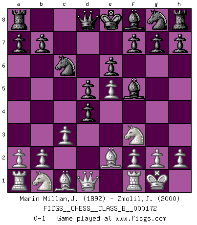 Last move : 0-1 2012 October 19 0:32:26 [Event "FICGS__CHESS__CLASS_B__000172"] [Site "FICGS"] [Date "2012.04.29"] [Round "1"] [White "Marin Millan,Jose Antonio"] [Black "Zmolil,Josef"] [Result "0-1"] [WhiteElo "1892"] [BlackElo "2000"] 1.e4 c6 2.d4 d5 3.e5 Bf5 4.Nf3 e6 5.Be2 c5 6.c3 Nc6 7.O-O cxd4 0-1 This chess game has been lost on time (started : 2012.04.29 3:59:29) Caro-Kann : Advance variation Kingside Castling by player White (move 7) Player Black won this chess game. Follow this game move after move (download)I'm not a materialistic person, in that, I don't suffer the lack or loss of money. The absence of worldly goods I don't look back on. For Chess is a way I can be as materialistic as I want without having to sell my soul. (Jamie Walter Adams) Wenn ich einen Club besuche, sind die Spieler stumm vor Staunen. (José Raúl Capablanca) Cuando tu no sabes absolutamente que mas hacer, es tiempo de entrar en pánico. (John van der Wiel) Les échecs c'est le défi de l'alpiniste, toujours plus haut, prêt à tout pour monter à l'assaut du Roi ennemi. Les échecs, c'est de la musique en mouvement, un ballet majestueux pour les yeux. C'est de la poésie composée par les fantômes du passé qui au même titre que Rimbaud ou Verlaine méritent notre admiration. Les échecs, c'est de la peinture ou le moindre mouvement modifie le tableau pour en faire un Picasso ou un Van Gogh. Les échecs, c'est tout et rien, c'est la vie et la mort. Jjulie33 sur le forum de France-Echecs. Treat your password like your toothbrush. Don't let anybody else use it, and get a new one every six months. (Clifford Stoll)