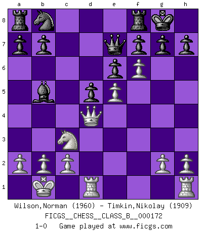 Last move : 1-0 2012 June 1 9:38:9 [Event "FICGS__CHESS__CLASS_B__000172"] [Site "FICGS"] [Date "2012.04.29"] [Round "1"] [White "Wilson,Norman"] [Black "Timkin,Nikolay"] [Result "1-0"] [WhiteElo "1960"] [BlackElo "1909"] 1.e4 c5 2.Nf3 Nc6 3.d4 cxd4 4.Nxd4 Nf6 5.Nc3 d6 6.Bg5 e6 7.Qd2 Be7 8.O-O-O O-O 9.f4 d5 10.e5 Nd7 11.Bxe7 Qxe7 12.Bb5 Nxd4 13.Qxd4 Nb8 14.Kb1 Bd7 15.f5 Bxb5 16.f6 1-0 Sicilian defense Queenside Castling by player White (move 8) Kingside Castling by player Black (move 8) Player White won this chess game. Follow this game move after move (download)There are two types of sacrifices: correct ones and mine. (Mikhail Tal) Das Schachspiel übertrifft alle anderen Spiele so weit wie der Chimborasso einen Misthaufen. (Arthur Schopenhauer) Siempre es mejor sacrificar los hombres de tu oponente. (Savielly Tartakower) La vérité est comme le meilleur coup aux échecs : elle existe, mais il faut la chercher. (Arturo Perez-Reverte) The general who wins the battle makes many calculations in his temple before the battle is fought. The general who loses makes but few calculations beforehand. (Sun Tzu)
