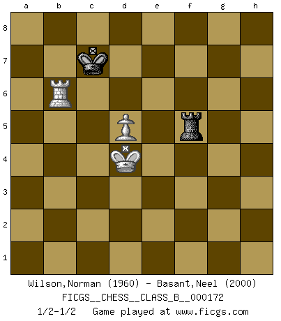 Last move : 1/2-1/2 2013 February 2 18:11:29 [Event "FICGS__CHESS__CLASS_B__000172"] [Site "FICGS"] [Date "2012.04.29"] [Round "1"] [White "Wilson,Norman"] [Black "Basant,Neel"] [Result "1/2-1/2"] [WhiteElo "1960"] [BlackElo "2000"] 1.e4 c5 2.Nf3 Nc6 3.d4 cxd4 4.Nxd4 g6 5.c4 Bg7 6.Be3 Qb6 7.Nb5 Qa5+ 8.N1c3 Nf6 9.f3 O-O 10.Be2 a6 11.Nd4 Nh5 12.Qd2 d6 13.Nb3 Bxc3 14.Qxc3 Qxc3+ 15.bxc3 Be6 16.Rb1 Nf6 17.Nd4 Na5 18.c5 Bxa2 19.Ra1 dxc5 20.Rxa2 cxd4 21.cxd4 Nc6 22.Kf2 Rfc8 23.Rb1 Nd8 24.d5 Nd7 25.g4 e6 26.Kg3 exd5 27.exd5 f6 28.h4 Rc3 29.Bd2 R3c8 30.h5 b5 31.Rba1 Nc5 32.Be3 Nf7 33.hxg6 hxg6 34.Bxb5 Nb3 35.Rb1 axb5 36.Rxa8 Rxa8 37.Rxb3 Rb8 38.Bd4 Ne5 39.Bxe5 fxe5 40.f4 e4 41.Kf2 Kf7 42.Ke3 Ke7 43.Kxe4 Kd6 44.f5 gxf5+ 45.gxf5 Re8+ 46.Kd4 Re5 47.Rxb5 Rxf5 48.Rb6+ Kc7 1/2-1/2 Sicilian : Accelerated Fianchetto, Maroczy bind, 6.Be3 Kingside Castling by player Black (move 9) 10 pieces endgame at move 39 : White KRPPP , Black KRPPP WHITE : King + 1 Rook 3 Pawns BLACK : King + 1 Rook 3 Pawns 9 pieces endgame at move 43 : White KRPPP , Black KRPP WHITE : King + 1 Rook 3 Pawns BLACK : King + 1 Rook 2 Pawns 8 pieces endgame at move 44 : White KRPP , Black KRPP WHITE : King + 1 Rook 2 Pawns BLACK : King + 1 Rook 2 Pawns 7 pieces endgame at move 45 : White KRPP , Black KRP WHITE : King + 1 Rook 2 Pawns BLACK : King + 1 Rook 1 Pawn 6 pieces endgame at move 47 : White KRPP , Black KR WHITE : King + 1 Rook 2 Pawns BLACK : King + 1 Rook 5 pieces endgame at move 47 : White KRP , Black KR WHITE : King + 1 Rook 1 Pawn BLACK : King + 1 Rook This chess game ended in a draw. Follow this game move after move (download)A win by an unsound combination, however showy, fills me with artistic horror. (Wilhelm Steinitz) Sehr viele beherrschen heutzutage das große Einmalseins des Schachspiels und kennen sogar dessen Logarithmentafeln auswendig - deshalb sollte man hin und wieder zu beweisen trachten, dass zwei mal zwei auch fünf sein kann. (Mikhail Nekhemyevich Tal) Ser exitoso en el Ajedrez te permite descubrir tu propia personalidad. Eso es lo que deseo para los niños de mi clase. (Saudin Robovic) On a dit que l'homme se distingue de l'animal par le fait qu'il achète plus de livres qu'il ne peut en lire. Je voudrais suggérer qu'inclure à la liste des livres quelques livres d'échecs rendrait la distinction manifeste. (Edward Lasker) Empty your mind, be formless, shapeless — like water. (Bruce Lee)