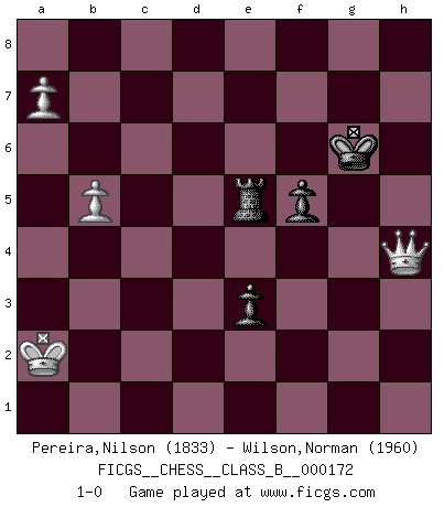 Last move : 1-0 2012 November 24 10:31:33 [Event "FICGS__CHESS__CLASS_B__000172"] [Site "FICGS"] [Date "2012.04.29"] [Round "1"] [White "Pereira,Nilson"] [Black "Wilson,Norman"] [Result "1-0"] [WhiteElo "1833"] [BlackElo "1960"] 1.e4 c5 2.Nf3 e6 3.d4 cxd4 4.Nxd4 Nf6 5.Nc3 d6 6.g4 h6 7.h4 Nc6 8.Rg1 d5 9.exd5 Nxd5 10.Nxd5 exd5 11.Qe2+ Be7 12.Be3 Nxd4 13.Bxd4 O-O 14.O-O-O Bxh4 15.f4 Re8 16.Qh2 Bf6 17.Bxf6 Qxf6 18.Bd3 g5 19.fxg5 Qxg5+ 20.Kb1 Bd7 21.Rdf1 Re7 22.a3 Rae8 23.Ka2 Kf8 24.Rg3 Re3 25.Rxe3 Rxe3 26.Qd6+ Re7 27.Bf5 Bxf5 28.gxf5 Kg8 29.Rh1 Re8 30.Rxh6 Qxf5 31.Qg3+ Kf8 32.Qh4 Kg7 33.Rh5 Qe6 34.Rh7+ Kg8 35.Rh6 Qe5 36.Rh5 Qe6 37.b3 Kg7 38.Qg3+ Kf8 39.Qg5 f6 40.Qf4 Qc6 41.Rh8+ Kg7 42.Qh6+ Kf7 43.Rh7+ Ke6 44.Qe3+ Kd6 45.Qf4+ Ke6 46.Rc7 Qb6 47.Qg4+ Ke5 48.Qh5+ Kd6 49.Qh2+ Re5 50.Rf7 Ke6 51.Qh7 Qf2 52.Re7+ Kd6 53.Rxb7 Re4 54.Qc7+ Ke6 55.Rxa7 Kf5 56.Qc8+ Kf4 57.Rf7 Re6 58.a4 Qe1 59.Qh8 Ke5 60.Qh2+ Kf5 61.Qh5+ Kf4 62.Rg7 Qe2 63.Qh4+ Ke5 64.Qg3+ Kd4 65.Qf4+ Qe4 66.c3+ Kxc3 67.Rg3+ Kd4 68.Qf2+ Ke5 69.Re3 f5 70.a5 Kf6 71.Rxe4 dxe4 72.b4 Kg6 73.b5 Re5 74.Qg3+ Kf6 75.a6 e3 76.Qh4+ Kg6 77.a7 1-0 Sicilian : Anderssen variation Kingside Castling by player Black (move 13) Queenside Castling by player White (move 14) 10 pieces endgame at move 66 : White KQRPP , Black KQRPP WHITE : King + 1 Queen 1 Rook 2 Pawns BLACK : King + 1 Queen 1 Rook 2 Pawns 9 pieces endgame at move 71 : White KQRPP , Black KRPP WHITE : King + 1 Queen 1 Rook 2 Pawns BLACK : King + 1 Rook 2 Pawns 8 pieces endgame at move 71 : White KQPP , Black KRPP WHITE : King + 1 Queen 2 Pawns BLACK : King + 1 Rook 2 Pawns Player White won this chess game. Follow this game move after move (download)The laws of Chess do not permit a free choice: you have to move whether you like it or not. (Emanuel Lasker) Schach sollte überall auf der Welt Schulfach werden. Es fördert die geistige Auseinandersetzung. Es lehrt die Demut in der Niederlage. (Garry Kasparov) Cuando estes solo, cuando te sientas un extraño en el mundo, juega al Ajedrez. Esto levantará tu espiritu y será tu consejero de guerra. (Aristóteles) Soyez une menace à chaque fois que vous vous asseyez pour jouer. (Ken Smith) See no evil, hear no evil, speak no evil. (The 3 monkeys)