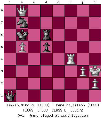Last move : 0-1 2012 December 23 11:44:23 [Event "FICGS__CHESS__CLASS_B__000172"] [Site "FICGS"] [Date "2012.04.29"] [Round "1"] [White "Timkin,Nikolay"] [Black "Pereira,Nilson"] [Result "0-1"] [WhiteElo "1909"] [BlackElo "1833"] 1.e4 c5 2.Nf3 d6 3.d4 cxd4 4.Nxd4 Nf6 5.Nc3 a6 6.Bg5 e6 7.f4 Qb6 8.Qd2 Qxb2 9.Rb1 Qa3 10.e5 dxe5 11.fxe5 h6 12.Bh4 Nd5 13.Nxd5 exd5 14.e6 Bxe6 15.Nxe6 fxe6 16.Bd3 Be7 17.Bg6+ Kd8 18.Bxe7+ Qxe7 19.O-O b5 20.Qa5+ Qc7 21.Qe1 Qd6 22.Qa5+ Kc8 23.Qc3+ Kb7 24.a4 Nd7 25.axb5 a5 26.Qxg7 Rhg8 27.Qh7 Raf8 28.c4 Kb6 29.Bf7 Rg4 30.Qxh6 Nc5 31.cxd5 Qxd5 32.g3 Qd4+ 33.Kg2 Rg7 34.Bg6 Rxf1 35.Rxf1 a4 36.Rf4 Qd2+ 37.Kh3 Rg8 38.Qh7 Rd8 39.Qh5 a3 40.Qf3 Rd6 41.Qa8 a2 42.Bh5 Qd5 43.Qb8+ Nb7 44.Bf3 a1Q 45.Bxd5 exd5 0-1 Sicilian : Najdorf, 7...Qb6 Kingside Castling by player White (move 19) Promotion Queen by player Black (move 44) Player Black won this chess game. Follow this game move after move (download)In the perfect Chess combination as in a first-rate short story, the whole plot and counter-plot should lead up to a striking finale, the interest not being allayed until the very last moment. (Yates and Winter) Wenn man heute mit 14 Jahren noch kein GM ist, kann man es vergessen. (Viswanathan Anand) Los asuntos humanos son como una partida de Ajedrez: solo aquellos que no lo toman seriamente, pueden ser llamados buenos jugadores. (Hung Tzu Ch'eng) Si je n'étais pas joueur d'échecs, je serais le meilleur dans quelque chose d'autre. (Anatoli Karpov) Everybody lies. (Gregory House, House M.D.)