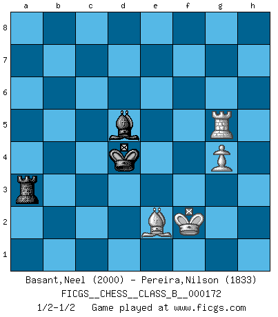 Last move : 1/2-1/2 2013 April 4 6:7:20 [Event "FICGS__CHESS__CLASS_B__000172"] [Site "FICGS"] [Date "2012.04.29"] [Round "1"] [White "Basant,Neel"] [Black "Pereira,Nilson"] [Result "1/2-1/2"] [WhiteElo "2000"] [BlackElo "1833"] 1.e4 c5 2.c3 Nf6 3.e5 Nd5 4.Nf3 Nc6 5.Bc4 Nb6 6.Bb3 c4 7.Bc2 Qc7 8.O-O Nxe5 9.Nxe5 Qxe5 10.Re1 Qc7 11.d3 cxd3 12.Qxd3 d6 13.Be3 e5 14.Na3 Qc6 15.Bxb6 axb6 16.Nb5 Be7 17.Red1 Bg4 18.f3 Be6 19.Nxd6+ Kf8 20.Nf5 g6 21.Nxe7 Kxe7 22.Qd2 Kf6 23.Qh6 Qc5+ 24.Kh1 Qf8 25.Qh4+ Kg7 26.a3 Rd8 27.h3 Bd5 28.a4 Qc5 29.Rd2 Rd7 30.c4 Be6 31.Rxd7 Bxd7 32.b3 Bc6 33.Rd1 Qa3 34.Qf2 Re8 35.Kh2 Qb2 36.Rd2 Qc3 37.Rd3 Qa5 38.Rd1 f5 39.Qd2 Qxd2 40.Rxd2 e4 41.fxe4 fxe4 42.Re2 e3 43.h4 Kf6 44.Kg3 h6 45.Kf4 Re6 46.g4 g5+ 47.hxg5+ hxg5+ 48.Kg3 Ke7 49.Re1 Kd6 50.b4 Be4 51.Bb3 Ke5 52.Rxe3 Kd4 53.Re1 Rf6 54.Bd1 Rf4 55.Be2 Kc3 56.c5 bxc5 57.bxc5 Kb4 58.Rd1 Kxc5 59.Rd7 Bd5 60.Rg7 Re4 61.Kf2 Rxa4 62.Rxg5 b5 63.Bxb5 Ra3 64.Be2 Kd4 1/2-1/2 Sicilian : Alapin's variation (2.c3) Kingside Castling by player White (move 8) 10 pieces endgame at move 58 : White KRBPP , Black KRBPP WHITE : King + 1 Rook 1 Bishop 2 Pawns BLACK : King + 1 Rook 1 Bishop 2 Pawns 9 pieces endgame at move 61 : White KRBP , Black KRBPP WHITE : King + 1 Rook 1 Bishop 1 Pawn BLACK : King + 1 Rook 1 Bishop 2 Pawns 8 pieces endgame at move 62 : White KRBP , Black KRBP WHITE : King + 1 Rook 1 Bishop 1 Pawn BLACK : King + 1 Rook 1 Bishop 1 Pawn 7 pieces endgame at move 63 : White KRBP , Black KRB WHITE : King + 1 Rook 1 Bishop 1 Pawn BLACK : King + 1 Rook 1 Bishop This chess game ended in a draw. Follow this game move after move (download)Pawns: they are the soul of this game, they alone form the attack and defense. (Philidor) Immer nach dem besten Zug zu suchen ist ziemlich unpraktisch. (Nigel Short) El Ajedrez tiene tanto misterio como las mujeres. (Purdy) Dieu déplace le joueur, et celui-ci la pièce. Quel Dieu derrière Dieu commence donc la trame ? Arturo Perez-Reverte (prix de littérature policière 1993). The best weapon against an enemy is another enemy. (Friedrich Nietzsche)