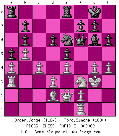 Last move : 1-0 2012 September 2 16:35:40 [Event "FICGS__CHESS__RAPID_E__000082"] [Site "FICGS"] [Date "2012.04.29"] [Round "1"] [White "Orden,Jorge"] [Black "Toro,Simone"] [Result "1-0"] [WhiteElo "1164"] [BlackElo "1030"] 1.e4 e5 2.Nf3 Nc6 3.Nc3 Nf6 4.Be2 Bb4 5.d3 O-O 6.Bd2 Re8 7.O-O d6 8.a3 Ba5 9.b4 Bb6 10.Na2 Bg4 11.h3 Bh5 12.c4 a6 13.a4 a5 14.b5 Nd4 15.Nc3 Nxe2+ 16.Qxe2 Nd7 17.Nd5 Nc5 18.g4 Bg6 19.Kh2 h6 20.Nxb6 cxb6 21.Ra3 Ne6 22.Kg3 Qf6 23.h4 1-0 This chess game has been lost on time (started : 2012.04.29 7:49:30) Four knights game Kingside Castling by player Black (move 5) Kingside Castling by player White (move 7) Player White won this chess game. Follow this game move after move (download)Checkers is for tramps. (Paul Morphy) Ohne ihre Erfolge schmälern zu wollen würde ich sagen Petrosian, Spassky und Karpov verdanken ihre Siege ihren Trainern - Boleslavsky, Bondarevsky und Furman. (Mikhail Moiseyevich Botvinik) Cuando me preguntan: -¿Cual es el secreto que te hace hacer mejores movidas que tus oponentes?, Yo respondo: Me da gusto que me pregunten eso, porque, como veran, hay una simple razón. Yo pienso mis propias movidas y dejo a mi oponente que el piense las suyas. (Alexander Alekhine) Il s'avisa de me proposer d'apprendre les échecs qu'il jouait un peu... me voilà forcené des échecs. J'achète un échiquier, je m'enferme dans ma chambre, j'y passe des jours et des nuits à vouloir apprendre par cur toutes les parties. (Jean-Jacques Rousseau, Confessions) Life is pain my dear and anyone who says otherwise is selling something. (Princess Bride)