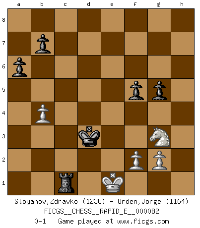 Last move : 0-1 2012 May 21 18:37:46 [Event "FICGS__CHESS__RAPID_E__000082"] [Site "FICGS"] [Date "2012.04.29"] [Round "1"] [White "Stoyanov,Zdravko"] [Black "Orden,Jorge"] [Result "0-1"] [WhiteElo "1238"] [BlackElo "1164"] 1.e4 c5 2.Nf3 d6 3.h3 Nf6 4.c3 Nxe4 5.Qa4+ Nc6 6.Qxe4 e6 7.Bb5 Bd7 8.Bxc6 Bxc6 9.Qe2 Be7 10.O-O O-O 11.d4 cxd4 12.Nxd4 Qc7 13.Qg4 g6 14.Bh6 Rfe8 15.Nd2 Bf8 16.Bg5 f5 17.Qe2 e5 18.Qc4+ d5 19.Nb5 Qd7 20.a4 dxc4 21.Nxc4 Bxb5 22.axb5 Qxb5 23.Ne3 h6 24.Bf6 Bg7 25.Bxg7 Kxg7 26.b4 Red8 27.Ra5 Qc6 28.Rxe5 Re8 29.Rc5 Qf6 30.Nd5 Qf7 31.Rc7 Rad8 32.Rxf7+ Kxf7 33.Nc7 Re7 34.Nb5 a6 35.Nd4 Rc7 36.Ne2 Rd2 37.Re1 Re7 38.Kf1 Kf6 39.Nf4 Rxe1+ 40.Kxe1 Rc2 41.h4 g5 42.Nd5+ Ke5 43.Nb6 Rxc3 44.Nd7+ Ke4 45.Nf6+ Kd4 46.hxg5 hxg5 47.Nh5 Kd3 48.Ng3 Rc1+ 0-1 Sicilian Kingside Castling by player White (move 10) Kingside Castling by player Black (move 10) Player Black won this chess game. Follow this game move after move (download)Modern Chess is too much concerned with things like Pawn structure. Forget it, Checkmate ends the game. (Nigel Short) Ein unbeabsichtigtes Patt ist der Gipfel der Dummheit. (Anonymous) Botvinnik trataba de restarle el misterio al Ajedrez, siempre relacionandolo a situaciones de la vida ordinaria. El gustaba de llamar al Ajedrez un típico problema inexacto similar a aquellos de los cuales la gente siempre tiene que enfrentarse en la vida cotidiana. (Garry Kasparov) Le génie consiste à savoir transgresser les règles au moment opportun. (Teichmann) Perception is reality. (Immanuel Kant)