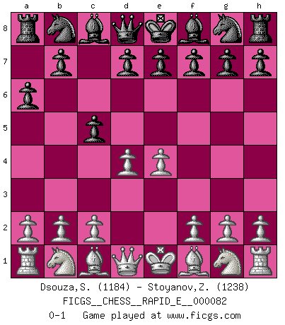 Last move : 0-1 2012 June 1 14:55:24 [Event "FICGS__CHESS__RAPID_E__000082"] [Site "FICGS"] [Date "2012.04.29"] [Round "1"] [White "Dsouza,Stanislaus"] [Black "Stoyanov,Zdravko"] [Result "0-1"] [WhiteElo "1184"] [BlackElo "1238"] 1.e4 c5 2.d4 a6 0-1 This chess game has been lost on time (started : 2012.04.29 7:49:30) Sicilian : Smith-Morra gambit Player Black won this chess game. Follow this game move after move (download)Personally, I rather look forward to a computer program winning the world Chess Championship. Humanity needs a lesson in humility. (Richard Dawkings) Jeder Fehler erscheint unglaublich dumm, wenn andre ihn begehen. (Georg Christoph Lichtenberg) Tu eres para mi la Reina en d8 y yo soy el Peón en d7!!. (GM Eduard Gufeld) On n'a jamais que l'âge auquel on a commence à jouer aux échecs car après on cesse de vieillir. (Capablanca) Looking at the proliferation of personal web pages on the Net, it looks like very soon everyone on Earth will have 15 megabytes of fame. (M.G. Sriram)