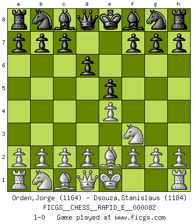 Last move : 1-0 2012 June 4 3:8:17 [Event "FICGS__CHESS__RAPID_E__000082"] [Site "FICGS"] [Date "2012.04.29"] [Round "1"] [White "Orden,Jorge"] [Black "Dsouza,Stanislaus"] [Result "1-0"] [WhiteElo "1164"] [BlackElo "1184"] 1.e4 e5 2.Nf3 d6 3.Be2 1-0 This chess game has been lost on time (started : 2012.04.29 7:49:30) Philidor's defense Player White won this chess game. Follow this game move after move (download)Fischer, who may or may not be mad as a hatter, has every right to be horrified. (Jeremy Silman) Ich glaube nicht an Psychologie, ich glaube an gute Züge. (Robert James Fischer) No existe un remordimiento como el remordimiento del Ajedrez. (H. G. Wells) La menace est plus forte que l'exécution. (Aaron Nimzovitch) There are two major products that came out of Berkeley: LSD and UNIX. We do not believe this is to be a coincidence. (Jeremy S. Anderson)