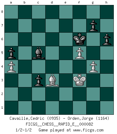 Last move : 1/2-1/2 2012 May 16 19:31:18 [Event "FICGS__CHESS__RAPID_E__000082"] [Site "FICGS"] [Date "2012.04.29"] [Round "1"] [White "Cavaille,Cedric"] [Black "Orden,Jorge"] [Result "1/2-1/2"] [WhiteElo "0935"] [BlackElo "1164"] 1.e4 c5 2.Nf3 d6 3.Bc4 Nf6 4.Nc3 e6 5.d4 cxd4 6.Nxd4 a6 7.a3 Be7 8.O-O O-O 9.b4 Nc6 10.Nxc6 bxc6 11.Bg5 Bb7 12.Bxf6 Bxf6 13.Qe1 c5 14.bxc5 dxc5 15.e5 Bg5 16.Qd1 Qxd1 17.Rfxd1 Rfd8 18.Rxd8+ Rxd8 19.f3 Bf4 20.Re1 Rd4 21.Bb3 Rd2 22.a4 Bd5 23.Nxd5 exd5 24.g3 Bg5 25.f4 Be7 26.Kf1 c4 27.Ba2 Rxc2 28.Bb1 Rb2 29.Bf5 Rxh2 30.Rb1 Rh1+ 31.Kg2 Rxb1 32.Bxb1 d4 33.Kf2 Bc5 34.f5 d3 35.Ke1 c3 36.Bxd3 a5 37.Kd1 Kf8 38.Ke2 Ke7 39.Kf3 f6 40.exf6+ Kxf6 41.g4 h6 1/2-1/2 Sicilian Kingside Castling by player White (move 8) Kingside Castling by player Black (move 8) This chess game ended in a draw. Follow this game move after move (download)What would Chess be without silly mistakes ? (Kurt Richter) Alle offensichtlichen Züge sehen nach dem Spiel in der Analyse verdächtig aus. (Viktor Kortschnoi) Los libros de Ajedrez deben de usarse igual como usamos los anteojos: para mejorar la vista, aunque algunos jugadores los quieren usar como si ellos les otorgaran la vision. (José Raúl Capablanca) A ce moment-là, je menaçais de comprendre la position ! (Clément L'Heureux) The only difference between a tax man and a taxidermist is that the taxidermist leaves the skin. (Mark Twain)