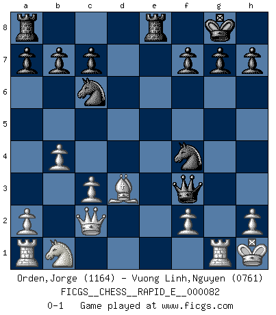 Last move : 0-1 2012 May 31 10:18:5 [Event "FICGS__CHESS__RAPID_E__000082"] [Site "FICGS"] [Date "2012.04.29"] [Round "1"] [White "Orden,Jorge"] [Black "Vuong Linh,Nguyen"] [Result "0-1"] [WhiteElo "1164"] [BlackElo "0761"] 1.e4 e5 2.Nf3 Nc6 3.c3 Nf6 4.Qc2 d5 5.exd5 Nxd5 6.Be2 Bd6 7.O-O O-O 8.d3 Bf5 9.Be3 Re8 10.b4 e4 11.dxe4 Bxe4 12.Bd3 Bxf3 13.gxf3 Qh4 14.f4 Bxf4 15.Bxf4 Nxf4 16.Kh1 Qh3 17.Rg1 Qf3+ 0-1 Ponziani : Jaenisch counter-attack Kingside Castling by player White (move 7) Kingside Castling by player Black (move 7) Player Black won this chess game. Follow this game move after move (download)Chess is a fairy tale of 1001 blunders. (Savielly Tartakower) Schach ist Leben. (Robert James Fischer) La única cosa que los jugadores de Ajedrez tienen en común, es el Ajedrez. (Lodewijk Prins) Les erreurs sont comme les malheurs, elles n'arrivent jamais seules. (Siegbert Tarrasch) Memory is a complicated thing, a relative to truth, but not its twin. (Barbara Kingsolver, Animal Dreams)