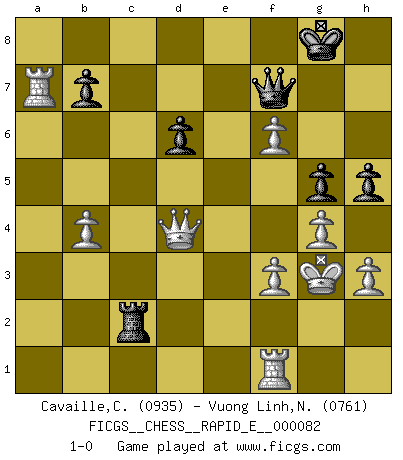 Last move : 1-0 2012 September 13 6:29:13 [Event "FICGS__CHESS__RAPID_E__000082"] [Site "FICGS"] [Date "2012.04.29"] [Round "1"] [White "Cavaille,Cedric"] [Black "Vuong Linh,Nguyen"] [Result "1-0"] [WhiteElo "0935"] [BlackElo "0761"] 1.e4 e5 2.Nf3 Nc6 3.Bc4 Bc5 4.d3 d6 5.Nc3 h6 6.O-O Nf6 7.a3 O-O 8.b4 Bb6 9.Nd5 Nd4 10.Nxb6 axb6 11.Nxd4 exd4 12.Bb2 c5 13.c3 cxb4 14.cxb4 Be6 15.Bxe6 fxe6 16.Bxd4 e5 17.Be3 b5 18.g4 Qe8 19.Kg2 Qg6 20.h3 Nh5 21.a4 bxa4 22.Rxa4 Rac8 23.Kh2 Nf4 24.Bxf4 Rxf4 25.f3 h5 26.Ra7 Qf7 27.d4 exd4 28.Qxd4 Rc2+ 29.Kg3 Rf6 30.e5 g5 31.exf6 1-0 This chess game has been lost on time (started : 2012.04.29 7:49:30) Giuoco Pianissimo Kingside Castling by player White (move 6) Kingside Castling by player Black (move 7) Player White won this chess game. Follow this game move after move (download)Bobby is the most misunderstood, misquoted celebrity walking the face of this earth. (Yasser Seirawan) Fischer: 'Remis!?' Uhlmann: 'Aber es muss doch dreimal Zugwiederholung sein!' Fischer: 'Sie nehmen das Remis an, wie ich es sage, sonst spiele ich weiter und werde Sie dann schlagen!' (Robert James Fischer) Aunque la mayoría de la gente disfruta observar las partidas de los grandes Maestros de ataque, algunos de los jugadores mas notables en la historia han sido los jugadores silenciosos posicionales. Lentamente ellos te aplastan despojandote de tu espacio, congestionando tus piezas y dejandote virtualmente sin nada que hacer. (Yasser Seirawan) Les réformistes prétendent que les progrès de la théorie conduiront à la disparition des échecs, et qu'il faut, pour leur rendre vie, en remanier les règles. En réalité, qu'exprime cette affirmation? Le mépris de l'intuition, de l'imagination et de tous les autres éléments qui font des échecs un art. (Alexander Alekhine) A good book on your shelf is a friend that turns its back on you and remains a friend. (Author unknown)