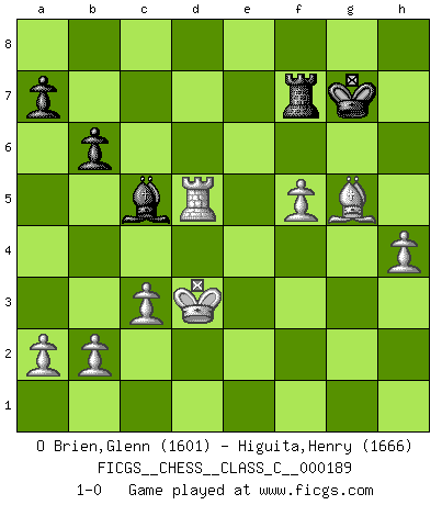 Last move : 1-0 2012 October 2 3:51:47 [Event "FICGS__CHESS__CLASS_C__000189"] [Site "FICGS"] [Date "2012.04.29"] [Round "1"] [White "O Brien,Glenn"] [Black "Higuita,Henry"] [Result "1-0"] [WhiteElo "1601"] [BlackElo "1666"] 1.e4 e5 2.Nf3 d6 3.d4 exd4 4.Nxd4 h6 5.Bc4 Nf6 6.Nc3 Be7 7.O-O O-O 8.Re1 c5 9.Nf3 Bg4 10.e5 dxe5 11.Qxd8 Bxd8 12.Nxe5 Bh5 13.Be3 Nbd7 14.Nxd7 Nxd7 15.Bb5 Bg4 16.Bxd7 Bxd7 17.Bxc5 Re8 18.Rxe8+ Bxe8 19.Rd1 b6 20.Bd4 f6 21.Nd5 Bg6 22.c3 Be4 23.Be3 f5 24.Nb4 Be7 25.f3 Bxb4 26.fxe4 Bf8 27.exf5 Re8 28.Bf4 Bc5+ 29.Kf1 Rf8 30.Rd5 g6 31.g4 Rf7 32.Bxh6 gxf5 33.gxf5 Kh7 34.Bg5 Rg7 35.h4 Rf7 36.Ke2 Kg7 37.Kd3 1-0 Philidor : Exchange variation Kingside Castling by player White (move 7) Kingside Castling by player Black (move 7) Player White won this chess game. Follow this game move after move (download)It is difficult to play against Einstein's theory --on his first loss to Fischer. (Mikhail Tal) Wenn man heute mit 14 Jahren noch kein GM ist, kann man es vergessen. (Viswanathan Anand) Te sientas frente a un tablero y repentinamente tu corazón brinca. Tu mano tiembla al tomar una pieza y moverla. Pero lo que el Ajedrez te enseña es que tu debes permanecer ahí con calma y pensar de que si realmente es una buena idea o de que si hay otras ideas mejores. (Stanley Kubrick) Les sacrifices démontrent seulement que quelqu'un a gaffé. (Savielly Tartacover) Life is pleasant. Death is peaceful. It's the transition that's troublesome. (Isaac Asimov)