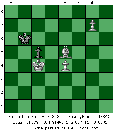 Last move : 1-0 2007 July 6 16:2:36 [Event "FICGS__CHESS__WCH_STAGE_1_GROUP_11__000002"] [Site "FICGS"] [Date "2007.01.16"] [Round "1"] [White "Haluschka,Rainer"] [Black "Ruano,Pablo"] [Result "1-0"] [WhiteElo "1820"] [BlackElo "1684"] 1.c4 e5 2.Nc3 Nf6 3.Nf3 Nc6 4.g3 Bb4 5.Nd5 Bc5 6.Bg2 d6 7.O-O O-O 8.e3 Bg4 9.Qc2 Be6 10.Ng5 Bxd5 11.cxd5 Nb4 12.Qc4 Nbxd5 13.d4 Bb6 14.Rd1 h6 15.dxe5 dxe5 16.Ne4 c6 17.a4 a5 18.b3 Nxe4 19.Bxe4 Qf6 20.Ba3 Rfd8 21.Rd3 Rd7 22.Rad1 Rad8 23.Bxd5 cxd5 24.Rxd5 Rxd5 25.Rxd5 Qf3 26.Rxd8+ Bxd8 27.h3 Qc6 28.Qxc6 bxc6 29.e4 f6 30.Bc1 Kf7 31.Kf1 Ke6 32.Ke2 Bb6 33.f3 h5 34.Kd3 g6 35.Bd2 Kd7 36.g4 Kc7 37.Bc3 hxg4 38.hxg4 g5 39.b4 Kb7 40.bxa5 Bc5 41.Kc4 Be7 42.Bb4 Bd8 43.Bd6 Bxa5 44.Be7 Bd2 45.Bxf6 Bf4 46.Be7 Bd2 47.Kc5 Bc1 48.Bf6 Ba3+ 49.Kc4 Ka6 50.Bxg5 Ka5 51.Bf6 Bd6 52.g5 Kxa4 53.g6 Bf8 54.Bxe5 Ka5 55.f4 Kb6 56.f5 c5 57.f6 Bh6 58.g7 Bxg7 59.fxg7 1-0 This chess game has been lost on time (started : 2007.01.16 15:22:40) English Opening Kingside Castling by player White (move 7) Kingside Castling by player Black (move 7) 10 pieces endgame at move 50 : White KBPPPP , Black KBPP WHITE : King + 1 Bishop 4 Pawns BLACK : King + 1 Bishop 2 Pawns 9 pieces endgame at move 52 : White KBPPP , Black KBPP WHITE : King + 1 Bishop 3 Pawns BLACK : King + 1 Bishop 2 Pawns 8 pieces endgame at move 54 : White KBPPP , Black KBP WHITE : King + 1 Bishop 3 Pawns BLACK : King + 1 Bishop 1 Pawn 7 pieces endgame at move 58 : White KBPP , Black KBP WHITE : King + 1 Bishop 2 Pawns BLACK : King + 1 Bishop 1 Pawn 6 pieces endgame at move 59 : White KBPP , Black KP WHITE : King + 1 Bishop 2 Pawns BLACK : King + 1 Pawn Player White won this chess game. Follow this game move after move (download)Nowadays, when you're not a grandmaster at 14, you can forget about it. (Anand Viswanathan) Dieses schreckliche Gefühl, dass ich gegen eine Maschine spielte, die niemals Fehler macht, zerschmetterte meinen Widerstand. (Mark Taimanov) Solo los afeminados hacen el Enroque. (Rob Sillars) Ne tendez aucun piège pour le plaisir ! Ne jouez rien dans l'espoir que l'adversaire réagisse de façon stupide ! Prenez toujours pour acquis que l'adversaire va trouver le meilleur coup ! Ne jouez jamais de coup dans l'espoir que l'adversaire ne voie pas la menace ! Chacun de vos coups doit améliorer la position d'une façon ou d'une autre. A good aphorism is too hard for the tooth of time, and is not worn away with the centuries, although it serves as food for every speech. (Friedrich Nietzsche)