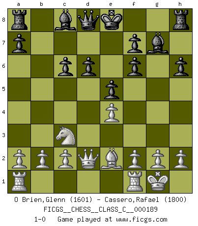 Last move : 1-0 2012 September 11 18:20:1 [Event "FICGS__CHESS__CLASS_C__000189"] [Site "FICGS"] [Date "2012.04.29"] [Round "1"] [White "O Brien,Glenn"] [Black "Cassero,Rafael"] [Result "1-0"] [WhiteElo "1601"] [BlackElo "1800"] 1.e4 c5 2.Nf3 d6 3.d4 cxd4 4.Nxd4 Nf6 5.Nc3 Nc6 6.Bg5 h6 7.Bxf6 gxf6 8.Qd2 e5 9.Nxc6 bxc6 10.Be2 Bg7 11.O-O 1-0 Sicilian : Richter-Rauzer Kingside Castling by player White (move 11) Player White won this chess game. Follow this game move after move (download)The stomach is an essential part of the Chess master. (Bent Larsen) Kein Großmeister ist normal. Sie unterscheiden sich nur im Ausmaß Ihrer Verrücktheit. (Viktor Kortschnoi) No es suficiente ser un buen jugador, se debe también de jugar bién. (Siegbert Tarrasch) Les écrivains ont utilisé les échecs pour analyser les côtés extrêmes de la nature humaine. Dans ce cadre, les échecs offrent un champ d'expérimentation idéal. Mais on pourrait faire la même chose avec la peinture. Et là, en vous référant à Van Gogh, vous ne tirerez pas de conclusion définitive sur les peintres. (Gary Kasparov) Every now and then a man's mind is stretched by a new idea and never shrinks back to its former dimensions. (Oliver Wendell Holmes, Sr.)