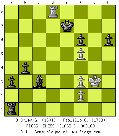 Last move : 0-1 2012 December 26 10:25:12 [Event "FICGS__CHESS__CLASS_C__000189"] [Site "FICGS"] [Date "2012.04.29"] [Round "1"] [White "O Brien,Glenn"] [Black "Paolillo,Giampiero"] [Result "0-1"] [WhiteElo "1601"] [BlackElo "1738"] 1.e4 e5 2.Nf3 Nc6 3.Bb5 a6 4.Ba4 Nf6 5.O-O Bc5 6.c3 b5 7.Bb3 d6 8.d4 Bb6 9.Bg5 h6 10.Bh4 g5 11.Bg3 Bg4 12.Qd3 O-O 13.Nbd2 Nh5 14.Bd5 Bd7 15.dxe5 Nxg3 16.hxg3 g4 17.exd6 gxf3 18.Nxf3 cxd6 19.e5 Kg7 20.exd6 Qf6 21.Bxc6 Bxc6 22.Rad1 Rfe8 23.Nd4 Be4 24.Qd2 Rad8 25.Qf4 Qxf4 26.gxf4 Kf6 27.Nf3 Bxf3 28.gxf3 Re2 29.d7 Ke7 30.Rd5 Rxb2 31.Re1+ Kf8 32.Rf1 Rxa2 33.Kg2 Be3 34.Kg3 Bd2 35.Rd1 Bxc3 36.Rd6 Ke7 37.R6d3 b4 38.Re3+ Kf8 39.Rd6 f6 40.Red3 a5 41.Re6 a4 42.Rd1 a3 43.f5 Ra1 44.Re8+ Rxe8 45.d8Q Rxd8 46.Rxd8+ Ke7 0-1 Ruy Lopez : Moeller defense Kingside Castling by player White (move 5) Kingside Castling by player Black (move 12) Promotion Queen by player White (move 45) Player Black won this chess game. Follow this game move after move (download)Nowadays, when you're not a grandmaster at 14, you can forget about it. (Anand Viswanathan) Nie in meinem Leben habe ich die französische Verteidigung gespielt, welche die Stumpfsinnigste von allen ist. (Wilhelm Steinitz) No solamente yo pronostico su triunfo sobre Botvinnik, sino que me adelanto y digo que probablemente Fischer es el jugador de Ajedrez mas grande que haya existido. (John Collins) Les Echecs ont trois composantes : le temps, l'espace et le matériel en dernier. (Mikhail Tal) It's not a bug - it's an undocumented feature. (Anonymous)
