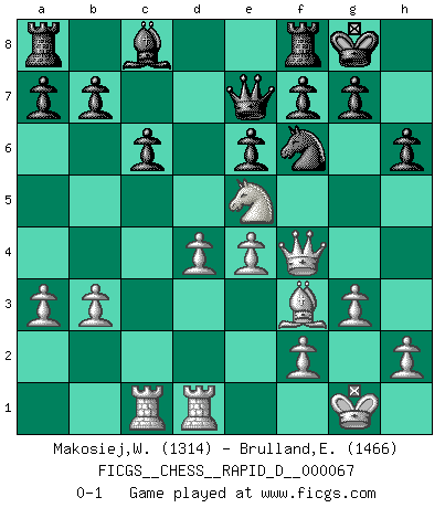 Last move : 0-1 2012 August 23 2:13:47 [Event "FICGS__CHESS__RAPID_D__000067"] [Site "FICGS"] [Date "2012.04.29"] [Round "1"] [White "Makosiej,Wladyslaw"] [Black "Brulland,Emmanuel"] [Result "0-1"] [WhiteElo "1314"] [BlackElo "1466"] 1.d4 d5 2.c4 c6 3.Nf3 e6 4.Qc2 Nf6 5.g3 Nbd7 6.Bg2 Be7 7.O-O O-O 8.Bf4 Re8 9.Nbd2 dxc4 10.Nxc4 Nb6 11.b3 Nbd5 12.Bd2 h6 13.Nce5 Bb4 14.a3 Bxd2 15.Qxd2 Nd7 16.e4 Nxe5 17.Nxe5 Nf6 18.Rac1 Nd7 19.Qf4 Nf6 20.Rfd1 Rf8 21.Bf3 Qe7 0-1 This chess game has been lost on time (started : 2012.04.29 14:24:57) QGD Slav : 3.Nf3 Kingside Castling by player White (move 7) Kingside Castling by player Black (move 7) Player Black won this chess game. Follow this game move after move (download)Do you realize Fischer almost never has any bad pieces? He exchanges them, and the bad pieces remain with his opponents. (Yuri Balashov) Er war ein guter Schachspieler, aber ich kann Leute nicht ausstehen, die 'Heil Hitler' rufen (Über Alexander Aljechin). (Miguel Najdorf) Sin errores no puede haber brillantez. (Emanuel Lasker) Vous savez, camarade Pachman, je n'éprouve pas de plaisir à être ministre, je jouerais plutôt aux échecs comme vous, ou alors ferais une révolution au Venezuela. (Che Guevara à Ludek Pachman, 'Checkmate in Prague', 1975) That's absurd. I love it. (Gregory House, House M.D.)