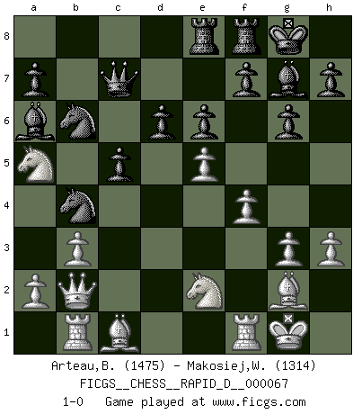 Last move : 1-0 2012 August 22 1:56:54 [Event "FICGS__CHESS__RAPID_D__000067"] [Site "FICGS"] [Date "2012.04.29"] [Round "1"] [White "Arteau,Benoit"] [Black "Makosiej,Wladyslaw"] [Result "1-0"] [WhiteElo "1475"] [BlackElo "1314"] 1.d4 Nf6 2.c4 g6 3.g3 Bg7 4.Bg2 O-O 5.e4 d6 6.Ne2 c5 7.d5 b5 8.Nd2 bxc4 9.Nxc4 Ba6 10.Qc2 Nbd7 11.O-O Rb8 12.Rb1 Ng4 13.f4 Nb6 14.Na5 Qc7 15.Nc6 Rbe8 16.h3 Nf6 17.b3 e6 18.e5 Nfxd5 19.Na5 Nb4 20.Qb2 1-0 This chess game has been lost on time (started : 2012.04.29 14:24:57) King's Indian : 3.g3 Kingside Castling by player Black (move 4) Kingside Castling by player White (move 11) Player White won this chess game. Follow this game move after move (download)If a ruler does not understand Chess, how can he rule over a kingdom ? (King Khusros II) Ein Isolani verdüstert die Stimmung auf dem ganzen Schachbrett. (Savielly Grigorievitsch Tartakower) No hay un Gran Maestro de Ajedrez que sea normal; solo se diferencían ellos por la magnitud de su locura. (Viktor Korchnoi) Le temps de noter son nom sur la feuille de partie, j'étais déjà en zeitnot ! D'un modeste amateur apparié lors de la première ronde d'un open contre le grand-maître Azmaïparashvili. Creativity involves breaking out of established patterns in order to look at things in a different way. (Edward De Bono)