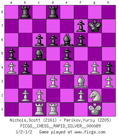 Last move : 1/2-1/2 2012 May 21 14:17:1 [Event "FICGS__CHESS__RAPID_SILVER__000089"] [Site "FICGS"] [Date "2012.05.01"] [Round "2"] [White "Nichols,Scott"] [Black "Perikov,Yuriy"] [Result "1/2-1/2"] [WhiteElo "2161"] [BlackElo "2205"] 1.e4 e5 2.Nc3 Nf6 3.g3 Bc5 4.Bg2 Nc6 5.d3 d6 6.Nge2 O-O 7.O-O Nd4 8.Nxd4 Bxd4 9.Bg5 c6 10.Qf3 Be6 11.Ne2 Bb6 12.a4 a5 13.g4 h6 14.Bxf6 Qxf6 15.Qxf6 gxf6 16.h3 h5 17.Bf3 h4 18.Nc3 Bc5 19.Nd1 Rfb8 20.Ne3 b5 21.Rfb1 b4 22.Ng2 Kg7 23.Rd1 Rd8 24.Rac1 Rab8 1/2-1/2 Vienna : Paulsen-Mieses variation Kingside Castling by player Black (move 6) Kingside Castling by player White (move 7) This chess game ended in a draw. Follow this game move after move (download)Chess is a beautiful mistress. (Bent Larsen) Wenn Schach ein enormer Dschungel ist, der seine Myriaden von Geheimnissen nicht preisgeben will, dann sind Computer die Kettensägen einer gewaltigen ökologisch unsensiblen Nutzholzfirma. (Nigel Short) Antes de los Finales, los dioses han colocado el Juego Medio. (Siegbert Tarrasch) Fischer est le meilleur joueur du monde et Karpov n'est qu'un joueur de bistrot. (Garry Kasparov, agé de 16 ans) This is where the fun begins. (Anakin Skywalker in Star Wars ep.3)
