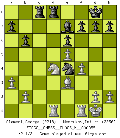 Last move : 1/2-1/2 2012 May 26 19:18:55 [Event "FICGS__CHESS__CLASS_M__000055"] [Site "FICGS"] [Date "2012.05.01"] [Round "1"] [White "Clement,George"] [Black "Mamrukov,Dmitri"] [Result "1/2-1/2"] [WhiteElo "2218"] [BlackElo "2256"] 1.e4 e6 2.d4 d5 3.Nc3 Nf6 4.e5 Nfd7 5.f4 c5 6.Nf3 Nc6 7.Be3 Be7 8.Qd2 O-O 9.Be2 b6 10.O-O Bb7 11.Rad1 Rc8 12.a3 Qc7 13.Nb5 Qb8 14.c4 cxd4 15.Nfxd4 Nxd4 16.Nxd4 Rfd8 17.cxd5 Bxd5 18.Ba6 Bb7 19.Bxb7 Qxb7 20.Qf2 Qe4 21.Qf3 Nc5 22.Qxe4 Nxe4 1/2-1/2 French : Steinitz, Boleslavsky variation Kingside Castling by player Black (move 8) Kingside Castling by player White (move 10) This chess game ended in a draw. Follow this game move after move (download)Many Chess players were surprised when after the game, Fischer quietly explained: 'I had already analyzed this possibility' in a position which I thought was not possible to foresee from the opening. (Mikhail Tal) Die größte Kunst beim Schach besteht darin dem Gegner nicht zu zeigen was er tun kann. (Garry Kasparov) La maestría del Ajedrez consiste esencialmente en analizar posiciónes de Ajedrez con precisión. (Mikhail Botvinnik) Le jeu d'échecs est comme rejeté hors du temps. (Antoine de Saint-Exupéry) Creativity is allowing yourself to make mistakes. Art is knowing which ones to keep. (Scott Adams)