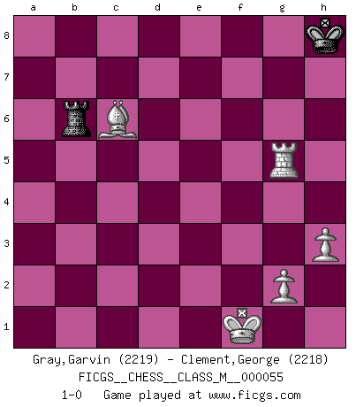 Last move : 1-0 2013 March 26 13:28:45 [Event "FICGS__CHESS__CLASS_M__000055"] [Site "FICGS"] [Date "2012.05.01"] [Round "1"] [White "Gray,Garvin"] [Black "Clement,George"] [Result "1-0"] [WhiteElo "2219"] [BlackElo "2218"] 1.d4 d5 2.c4 c6 3.Nf3 Nf6 4.Nc3 e6 5.Bg5 h6 6.Bxf6 Qxf6 7.e3 Nd7 8.Bd3 dxc4 9.Bxc4 g6 10.O-O Bg7 11.Qc2 O-O 12.Ne4 Qe7 13.Bb3 e5 14.Ng3 Kh8 15.Rac1 Re8 16.Rfe1 e4 17.Nd2 f5 18.Ne2 Nf6 19.h3 Kh7 20.a3 Bd7 21.Nf4 Rac8 22.Ba2 g5 23.Ne2 Nd5 24.Qa4 Ra8 25.Qc2 Be6 26.Ng3 Bh8 27.Bc4 Rac8 28.b4 b6 29.Bb3 Qd7 30.Nc4 Qe7 31.Qb1 Rf8 32.Red1 Bd7 33.Nd2 Nc7 34.f3 exf3 35.Nxf3 Qxe3+ 36.Kh2 Be6 37.Bc2 Qf4 38.Rf1 Nb5 39.Nh4 Nxa3 40.Rxf4 Nxb1 41.Rxf5 Bxf5 42.Nhxf5 Nd2 43.Rd1 Nc4 44.Nd6 Kg8 45.Nxc4 Rf2 46.Ne3 Re8 47.Kg1 Ref8 48.Bd3 Rb2 49.Ngf5 Bf6 50.d5 cxd5 51.Nxd5 Kh8 52.Be4 Bd8 53.Nxh6 b5 54.Nf5 Re8 55.Bf3 a5 56.Nd6 Rf8 57.bxa5 Bxa5 58.Ra1 Ra8 59.Kf1 Ra7 60.Nc8 Ra8 61.Nde7 Ra6 62.Nc6 Rc2 63.Nb8 Re6 64.Rxa5 b4 65.Rb5 Rxc8 66.Rxb4 Rc7 67.Rb5 Rd6 68.Rxg5 Rb6 69.Nc6 R7xc6 70.Bxc6 1-0 QGD Slav : 4.Nc3 Kingside Castling by player White (move 10) Kingside Castling by player Black (move 11) 10 pieces endgame at move 66 : White KRBNPP , Black KRRP WHITE : King + 1 Rook 1 Bishop 1 Knight 2 Pawns BLACK : King + 2 Rooks 1 Pawn 9 pieces endgame at move 68 : White KRBNPP , Black KRR WHITE : King + 1 Rook 1 Bishop 1 Knight 2 Pawns BLACK : King + 2 Rooks 8 pieces endgame at move 69 : White KRBPP , Black KRR WHITE : King + 1 Rook 1 Bishop 2 Pawns BLACK : King + 2 Rooks 7 pieces endgame at move 70 : White KRBPP , Black KR WHITE : King + 1 Rook 1 Bishop 2 Pawns BLACK : King + 1 Rook Player White won this chess game. Follow this game move after move (download)Chess is a terrible game. If you have no center, your opponent has a freer position. If you do have a center, then you really have something to worry about ! (Siegbert Tarrasch) Schach ist mein Leben, meine Leidenschaft, was ich gelernt habe und seit meinem 14. Lebensjahr profimässig praktiziere. Darauf zu verzichten, würde mir sehr schwer fallen. (Viktor Kortschnoi) Con el tiempo, empecé a progresar en partidas decisivas. Tal vez porque me di cuenta de una simple verdad: no solo estaba yo nervioso sino también mi oponente. (Mikhail Tal) Aux échecs, les retours au sommet sont rares : les dommages psychologiques consécutifs à une défaite sont trop sévères. (Daily Telegraph) They say in chess you've got to kill the queen, and then you mate it... Oh I, do you ? (Red Hot Chili Peppers, Fortune faded)