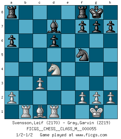 Last move : 1/2-1/2 2012 November 8 15:33:32 [Event "FICGS__CHESS__CLASS_M__000055"] [Site "FICGS"] [Date "2012.05.01"] [Round "1"] [White "Svensson,Leif"] [Black "Gray,Garvin"] [Result "1/2-1/2"] [WhiteElo "2170"] [BlackElo "2219"] 1.e4 e6 2.d4 d5 3.exd5 exd5 4.Nf3 Nc6 5.Bb5 Bd6 6.c4 dxc4 7.d5 a6 8.Ba4 b5 9.dxc6 bxa4 10.O-O Ne7 11.Nbd2 Be6 12.Qxa4 c3 13.Nc4 Bd5 14.bxc3 Bxc6 15.Qd1 O-O 16.Nxd6 Qxd6 17.Qxd6 cxd6 18.Nd4 Bd7 19.Rb1 Nf5 20.Rd1 1/2-1/2 French : Exchange variation Kingside Castling by player White (move 10) Kingside Castling by player Black (move 15) This chess game ended in a draw. Follow this game move after move (download)Chess is above all, a fight ! (Emanuel Lasker) Ich erzeugte keinen Neid, da mich die Schachspieler als Musiker und die Musiker als Schachspieler betrachteten. (Mark Taimanov) Realmente no sabemos como el juego fue inventado, aunque hay sospechas. Tan pronto como descubramos a los culpables, se los haremos saber. (Bruce Pandolfini) Lorsque vous vous retrouvez devant une position atroce, ne tendez pas un ultime piège dérisoire avec l'intention d'abandonner si l'adversaire le déjoue ! Faites-vous plutôt un devoir de résister comme si votre vie en dépendait. Jouez le coup qui vous déplairait au centuple si vous étiez dans la peau de votre tortionnaire ! Now be brave and don't look back. Don't look back. (Shmi Skywalker in Star Wars ep.1)