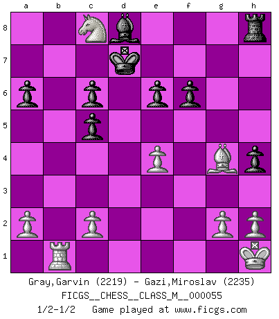 Last move : 1/2-1/2 2013 January 8 8:13:4 [Event "FICGS__CHESS__CLASS_M__000055"] [Site "FICGS"] [Date "2012.05.01"] [Round "1"] [White "Gray,Garvin"] [Black "Gazi,Miroslav"] [Result "1/2-1/2"] [WhiteElo "2219"] [BlackElo "2235"] 1.e4 c5 2.Nf3 d6 3.d4 cxd4 4.Nxd4 Nf6 5.Nc3 a6 6.Bg5 e6 7.f4 h6 8.Bh4 Qb6 9.Qd2 Qxb2 10.Rb1 Qa3 11.Bxf6 gxf6 12.Be2 Qa5 13.O-O h5 14.Kh1 Be7 15.f5 Nc6 16.Nxc6 bxc6 17.Qe3 h4 18.Bg4 Qe5 19.Na4 Bd8 20.fxe6 fxe6 21.Nb6 Rb8 22.Nc4 Rxb1 23.Rxb1 Qc5 24.Qxc5 dxc5 25.Nd6+ Kd7 26.Nxc8 1/2-1/2 Sicilian : Najdorf, 7.f4 Kingside Castling by player White (move 13) This chess game ended in a draw. Follow this game move after move (download)I am still a victim of Chess. It has all the beauty of art and much more. It cannot be commercialized. Chess is much purer than art in its social position. (Marcel Duchamp) Smyslow ist ein Beweis dafür, dass ich noch zehn Jahre spielen kann! [der 75 jährige über den 85 jährigen] (Viktor Kortschnoi) El juego de Fischer siempre fue nítido, racional y brillante. Uno de los mejores por siempre. (Dave Regis) Shah mat. Le roi est mort. Cri de fierté d'un joueur venant de terrasser son adversaire, courtoisement, sans effusion de sang. Train yourself to let go of everything you fear to lose. (Master Yoda in Star Wars ep.3)