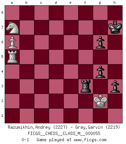 Last move : 0-1 2013 January 20 16:48:55 [Event "FICGS__CHESS__CLASS_M__000055"] [Site "FICGS"] [Date "2012.05.01"] [Round "1"] [White "Razumikhin,Andrey"] [Black "Gray,Garvin"] [Result "0-1"] [WhiteElo "2227"] [BlackElo "2219"] 1.e4 e5 2.Nf3 Nc6 3.Bc4 Bc5 4.c3 Nf6 5.d3 h6 6.O-O d6 7.b4 Bb6 8.a4 a5 9.b5 Ne7 10.Bb3 Ng6 11.Nbd2 O-O 12.Nc4 Ba7 13.Re1 Re8 14.h3 Be6 15.Rb1 Qd7 16.Bd2 Re7 17.Qe2 Nh5 18.Kh2 c6 19.bxc6 bxc6 20.g3 Bxh3 21.Nh4 Bg4 22.f3 Be6 23.Nxg6 fxg6 24.Nxa5 d5 25.exd5 cxd5 26.c4 Rf8 27.cxd5 Bxd5 28.Bxd5+ Qxd5 29.Kg2 Ref7 30.Rf1 Rd7 31.Rb3 g5 32.Nc4 g4 33.Rb5 Qxd3 34.Rxe5 Rc8 35.Re8+ Rxe8 36.Qxe8+ Kh7 37.Qe4+ Qxe4 38.fxe4 Rd4 39.Rc1 Rxe4 40.Be1 Re2+ 41.Kf1 Ra2 42.a5 Bb8 43.Rc3 Ra4 44.Kg2 Nf6 45.Rb3 Bc7 46.Nb6 Ra2+ 47.Kf1 Ra1 48.Ke2 Ra2+ 49.Kf1 Ne4 50.Re3 Ng5 51.Bb4 Nf3 52.Ra3 Rb2 53.Bc5 Nd2+ 54.Kg1 Rb5 55.Bf2 Ne4 56.Nc4 Bb8 57.Ra4 Rb1+ 58.Kg2 Rc1 59.Ne3 Nxf2 60.Kxf2 h5 61.a6 Ba7 62.Ke2 Rc3 63.Nf5 Rf3 64.Ra5 g6 65.Nd6 Rxg3 66.Nc8 Re3+ 67.Kf1 Rf3+ 68.Kg2 h4 69.Nxa7 h3+ 0-1 Giuoco Piano Kingside Castling by player White (move 6) Kingside Castling by player Black (move 11) 10 pieces endgame at move 65 : White KRNP , Black KRBPPP WHITE : King + 1 Rook 1 Knight 1 Pawn BLACK : King + 1 Rook 1 Bishop 3 Pawns 9 pieces endgame at move 69 : White KRNP , Black KRPPP WHITE : King + 1 Rook 1 Knight 1 Pawn BLACK : King + 1 Rook 3 Pawns Player Black won this chess game. Follow this game move after move (download)Morphy was probably the greatest genius of them all. (Bobby Fischer) Mit sehr nachdenklichem Gesicht schreitet Bobby durch den Turniersaal. Was ist passiert?, fragt Lombardy. Ich stehe schlecht, antwortet Fischer. Lombardy: Dann biete doch einfach Remis an. Fischer: So schlecht stehe ich nun auch wieder nicht! (Robert James Fischer) Cuando le juegas a Fischer, no es una cuestion de si vas a ganar o perder. Es una cuestion de si vas a sobrevivir. (Boris Spassky) Avec des compensations pour le matériel en plus... (Anonyme) Being number two sucks. (Andre Agassi)
