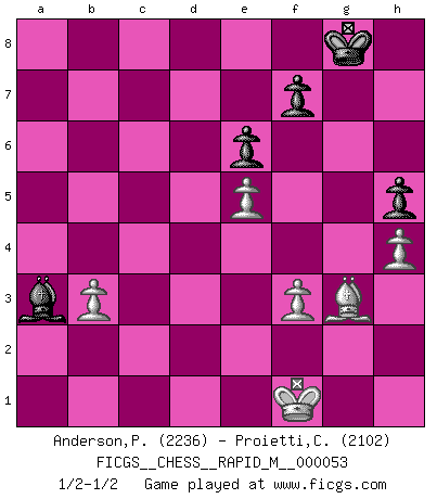 Last move : 1/2-1/2 2012 May 27 13:41:20 [Event "FICGS__CHESS__RAPID_M__000053"] [Site "FICGS"] [Date "2012.05.01"] [Round "1"] [White "Anderson,Peter W."] [Black "Proietti,Costantino"] [Result "1/2-1/2"] [WhiteElo "2236"] [BlackElo "2102"] 1.d4 d5 2.c4 c6 3.Nf3 Nf6 4.Nc3 e6 5.Bg5 h6 6.Bh4 dxc4 7.e4 g5 8.Bg3 b5 9.Be2 Bb7 10.h4 g4 11.Ne5 h5 12.O-O Nbd7 13.Qc2 Nxe5 14.Bxe5 Bh6 15.b3 cxb3 16.axb3 O-O 17.Rfd1 Qe7 18.Bg3 a5 19.e5 Nd5 20.Ne4 Rfd8 21.Bd3 Rd7 22.Nd6 b4 23.Ne4 Bg7 24.Bf1 Nc3 25.Nxc3 bxc3 26.Qxc3 Rad8 27.Rxa5 Bf8 28.Qe3 c5 29.Rxc5 Rxd4 30.Rxd4 Rxd4 31.Qxd4 Qxc5 32.Qxc5 Bxc5 33.Be2 Be4 34.Kf1 Ba3 35.f3 gxf3 36.Bxf3 Bxf3 37.gxf3 1/2-1/2 Comment by player 1 : Peter W. Anderson : 24...Nc3 certainly seems best. The star move was 26...Rad8. Black should be able to hold after other moves but would have a tougher defensive task. But after 26...Rad8 white has nothing better than the double bishop ending a pawn up. Normally this type of ending would be won, but in this one white has specific problems unravelling his k-side and the ending appears to be drawn. Good defensive work :) Comment by player 2 : Costantino Proietti : My opponent put a strain on my coronaries. The analysis of this game demonstrates the Moscow gambit is full of possibilities, especially for white so black has to play carefully to reach equality. 15..Bh6!? seems to be a sharp move (better seems 15...Rg8 as I don't like 15. Bg7?! The first critical position occurred on 21. Bd3! where the scene is suddenly changed. So 21..b4? is wrong for 22. Bc4! . An other possibility is 21...Bg7!? 22.Qc1 b4 ( 22...Rd7!?) 23. Bf1! The second dangerous positions is after 24. Bf1! as the only correct move is 24...Nc3!. All the other moves lose. A very interesting game! QGD Slav : 4.Nc3 Kingside Castling by player White (move 12) Kingside Castling by player Black (move 16) This chess game ended in a draw. Follow this game move after move (download)If a ruler does not understand Chess, how can he rule over a kingdom ? (King Khusros II) Die Idee von Capablanca, Schach als Fach in den Schulen zu lehren, ist großartig. (Fidel Castro) Aquel que toma al Peón de Caballo de la Reina, se pasará la noche a dormir en la calle. (Anónimo) Des points faibles ou des trous dans la position de l'adversaire doivent être occupés par des pièces et non pas par des pions. (Siegbert Tarrasch) The leaves of memory seemed to make a mournful rustling in the dark. (Henry Wadsworth Longfellow)