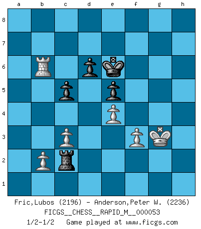 Last move : 1/2-1/2 2012 October 30 9:17:8 [Event "FICGS__CHESS__RAPID_M__000053"] [Site "FICGS"] [Date "2012.05.01"] [Round "1"] [White "Fric,Lubos"] [Black "Anderson,Peter W."] [Result "1/2-1/2"] [WhiteElo "2196"] [BlackElo "2236"] 1.e4 g6 2.d4 Bg7 3.Nf3 d6 4.Nc3 Nf6 5.Be2 O-O 6.O-O e6 7.Be3 h6 8.h3 Nc6 9.Qd2 Kh7 10.Rad1 Ne7 11.Bd3 b6 12.Bf4 Bb7 13.Rfe1 a6 14.a4 Nd7 15.Bc4 g5 16.Be3 Ng6 17.d5 Nde5 18.Nxe5 Nxe5 19.Bb3 Qe7 20.Bd4 Rg8 21.f3 Rae8 22.Ne2 h5 23.Ng3 g4 24.hxg4 Bh6 25.Be3 Qh4 26.Bxh6 Nxf3+ 27.gxf3 Qxg3+ 28.Qg2 Qxg2+ 29.Kxg2 Kxh6 30.dxe6 fxe6 31.Rh1 Rg5 32.Kf2 Rf8 33.Ke3 e5 34.Rd3 Kg6 35.Rxh5 Rxh5 36.gxh5+ Kxh5 37.Rc3 c5 38.Rd3 Rf6 39.Bd5 Bxd5 40.Rxd5 b5 41.axb5 axb5 42.c3 Kh4 43.Rd1 Rg6 44.Rh1+ Kg5 45.Rh8 Kf6 46.Kf2 Ke6 47.Rb8 Rh6 48.Rxb5 Rh2+ 49.Kg3 Rd2 50.Rb7 Rc2 51.Rb6 1/2-1/2 Robatsch (Modern) defense Kingside Castling by player Black (move 5) Kingside Castling by player White (move 6) This chess game ended in a draw. Follow this game move after move (download)In the perfect Chess combination as in a first-rate short story, the whole plot and counter-plot should lead up to a striking finale, the interest not being allayed until the very last moment. (Yates and Winter) Ich bewundere Kasparows phantasievolle Angriffssiege aus den Achtzigern und Neunzigern, aber wenn man sie mit dem Computer überprüft, nimmt der Computer in jeder zweiten Partie die Opfer an, verteidigt sich und gewinnt. (Vladimir Kramnik) Repentinamente, me resultaba obvio en mi analisis que yo había pasado por alto lo que Fischer había visto en el tablero con la mas grande facilidad. (Mikhail Botvinnik) Les Echecs sont affaire de jugement sensible. Savoir quand frapper et quand esquiver. (Fischer) All the troubles of the world come from being unable to sit alone in a quiet room. (Blaise Pascal)