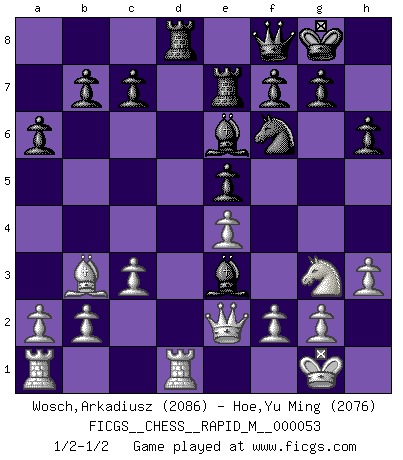 Last move : 1/2-1/2 2012 October 11 15:15:51 [Event "FICGS__CHESS__RAPID_M__000053"] [Site "FICGS"] [Date "2012.05.01"] [Round "1"] [White "Wosch,Arkadiusz"] [Black "Hoe,Yu Ming"] [Result "1/2-1/2"] [WhiteElo "2086"] [BlackElo "2076"] 1.e4 e5 2.Nf3 Nc6 3.Bc4 Bc5 4.c3 Nf6 5.d3 d6 6.O-O a6 7.Bb3 Ba7 8.Nbd2 O-O 9.h3 h6 10.Re1 Be6 11.Nf1 Re8 12.Ng3 d5 13.Qe2 Qd6 14.Nh4 dxe4 15.dxe4 Rad8 16.Rd1 Qf8 17.Nhf5 Ne7 18.Be3 Bxe3 19.Nxe7+ Rxe7 1/2-1/2 Giuoco Piano Kingside Castling by player White (move 6) Kingside Castling by player Black (move 8) This chess game ended in a draw. Follow this game move after move (download)A Chess game is divided into three stages: the first, when you hope you have the advantage, the second when you believe you have an advantage, and the third... when you know you're going to lose ! (Savielly Tartakower) Schach ist eine Sache der genauen Beurteilung, wann man zuschlagen und wann man sich ducken muss. (Robert James Fischer) Robert Fischer es la ley hacia si mismo. (Larry Evans) Toutes les manuvres exécutées sur une colonne ouverte ont pour but ultime l'intrusion définitive sur la septième ou la huitième rangée, en plein cur de la position ennemie. (Aaron Nimzovitch) How many people work in NATO Headquarters ? - About half of them. (Dirk Stikker, NATO general secretary)
