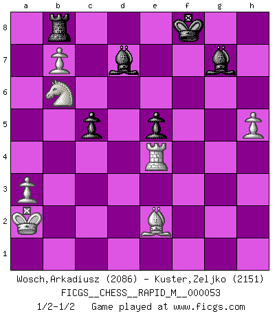Last move : 1/2-1/2 2012 October 12 13:10:59 [Event "FICGS__CHESS__RAPID_M__000053"] [Site "FICGS"] [Date "2012.05.01"] [Round "1"] [White "Wosch,Arkadiusz"] [Black "Kuster,Zeljko"] [Result "1/2-1/2"] [WhiteElo "2086"] [BlackElo "2151"] 1.e4 c5 2.Nf3 d6 3.d4 cxd4 4.Nxd4 Nf6 5.Nc3 Nc6 6.Bg5 e6 7.Qd2 a6 8.O-O-O Bd7 9.f4 b5 10.Bxf6 gxf6 11.Kb1 Qb6 12.Nxc6 Bxc6 13.Qe1 Ra7 14.Bd3 Rg8 15.Rg1 b4 16.Ne2 a5 17.f5 Qc5 18.fxe6 fxe6 19.Rf1 Re7 20.Nf4 a4 21.Ba6 b3 22.cxb3 axb3 23.a3 Qe5 24.Bd3 Bh6 25.g3 Rc7 26.Rc1 Kd7 27.Rc3 Ra8 28.Rxb3 R8a7 29.Qe2 Rab7 30.Rxb7 Rxb7 31.Ka2 Rb8 32.h4 Bg7 33.Rb1 Ke7 34.b4 Bd7 35.Rc1 Kd8 36.Qf2 Ra8 37.Qd2 Ke7 38.b5 Qd4 39.Rc4 Qe5 40.b6 f5 41.Qc1 Rb8 42.Rb4 fxe4 43.Bxe4 Rc8 44.Qb1 Qc3 45.b7 Rb8 46.Bxh7 Qxg3 47.Bd3 Qf2+ 48.Be2 Qc5 49.Ba6 Bc3 50.Re4 Qf2+ 51.Be2 Bg7 52.h5 e5 53.Nd5+ Kf8 54.Qb4 Qc5 55.Qxc5 dxc5 56.Nb6 1/2-1/2 Sicilian : Richter-Rauzer, Rauzer attack, 7...a6 Queenside Castling by player White (move 8) This chess game ended in a draw. Follow this game move after move (download)Chess is above all, a fight ! (Emanuel Lasker) Schachspieler können ausgezeichnet Varianten am Schachbrett berechnen, aber nicht im realen Leben. Zu stark ist der Individualismus im Schach ausgeprägt, und für viele ist ein kleiner momentaner persönlicher Vorteil wichtiger als ein weit größerer Vorteil von morgen. (Anatoly Karpov) Los Peones son nacidos libres, y aún así, se encuentran encadenados por todos lados. (Rick Kennedy) Ce qui caractérise les parties de combat, c'est que si le défenseur a constamment de difficiles problèmes à résoudre, l'attaquant doit chercher sans relâche de nouvelles possibilités d'attaque. (Koblentz) There is a very easy way to return from a casino with a small fortune : go there with a large one. (Jack Yelton)